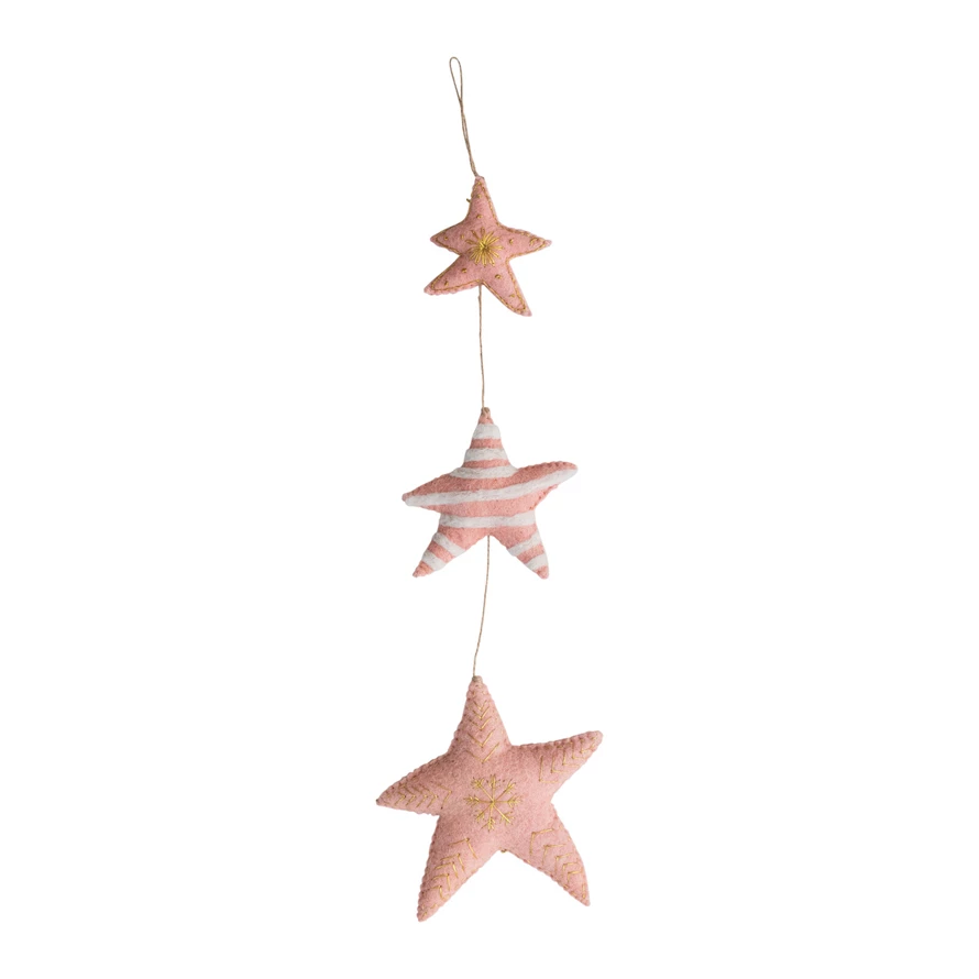 Catalog Name: 19"H Handmade Wool Felt Stars Hanging w/ Metallic Thread Embroidery, Blush & Cream Color ©