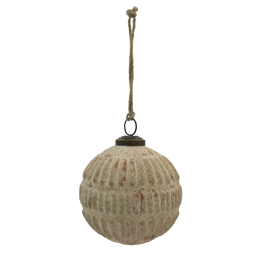 Catalog Name: 3" Round Embossed Glass Ball Ornament, Distressed Frosted Finish, Terra-cotta Color