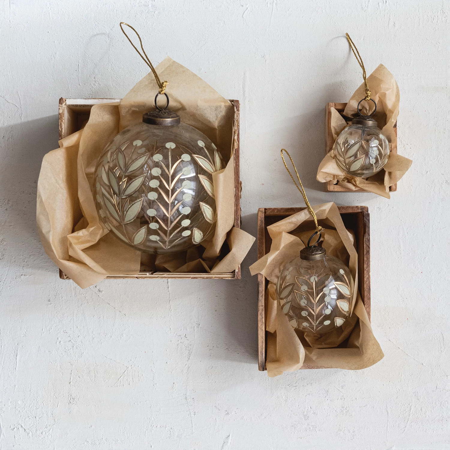Hand-Painted Etched Glass Ball Ornament with Botanicals Design