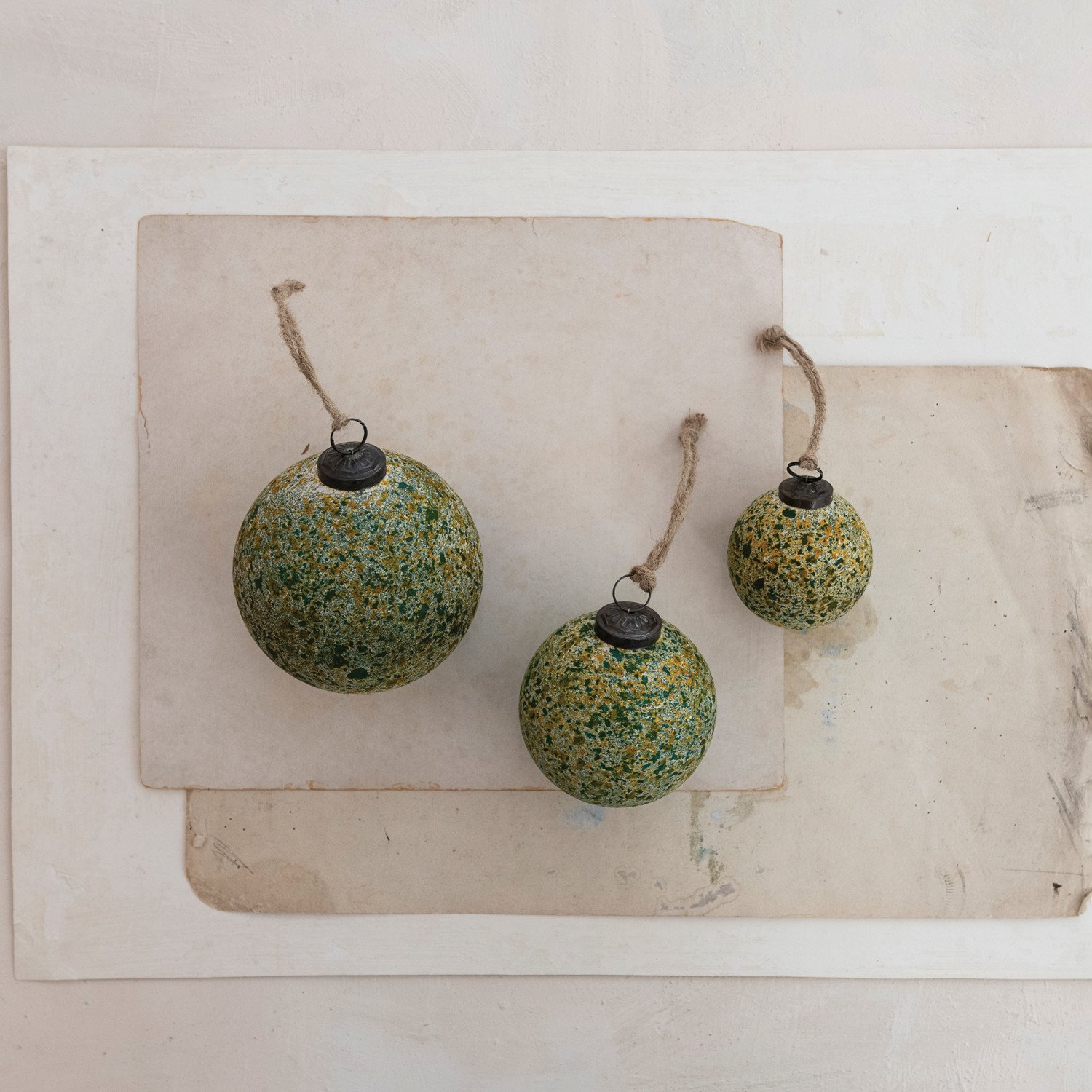 Catalog Name: 4" Round Glass Ball Ornament, Distressed Green & Gold Finish