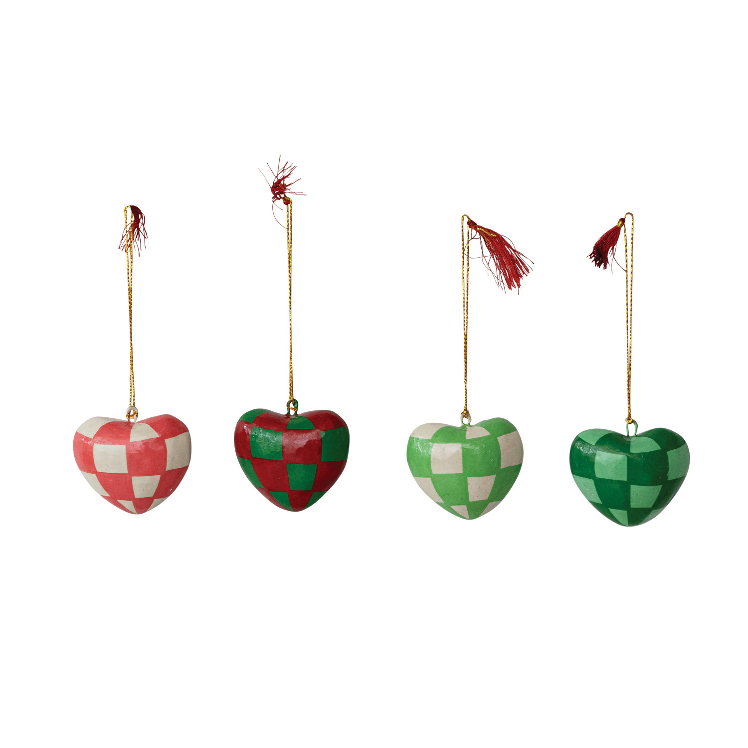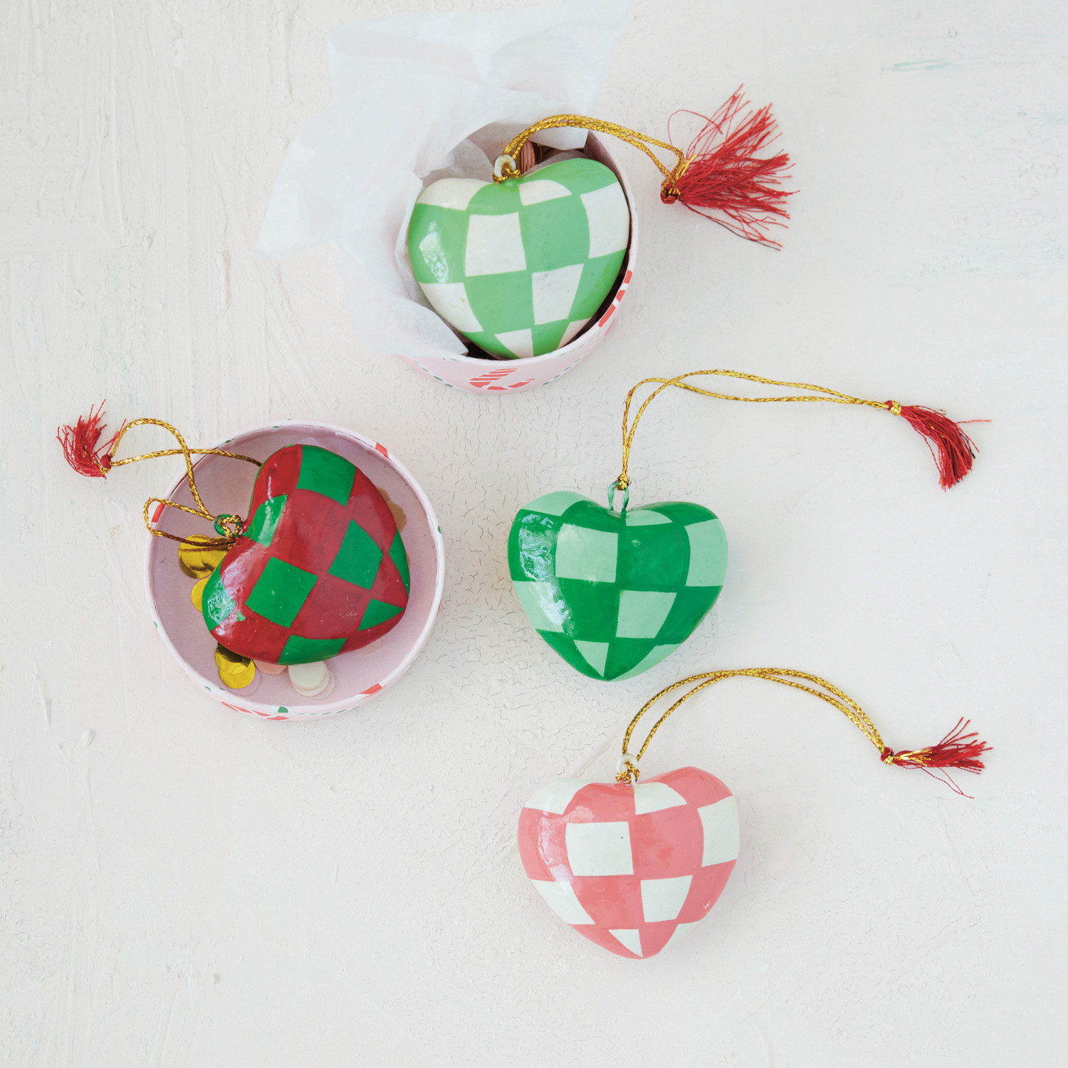 Catalog Name: 2"H Hand-Painted Paper Mache Heart Ornament w/ Check Pattern, 4 Colors