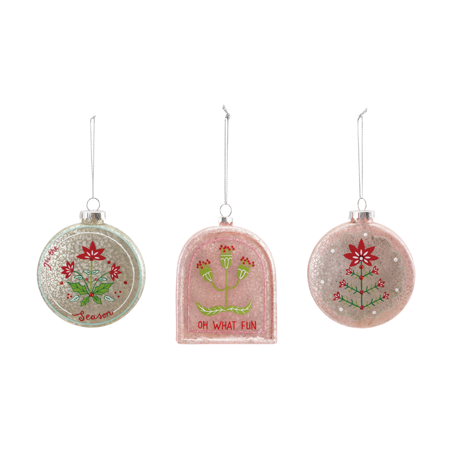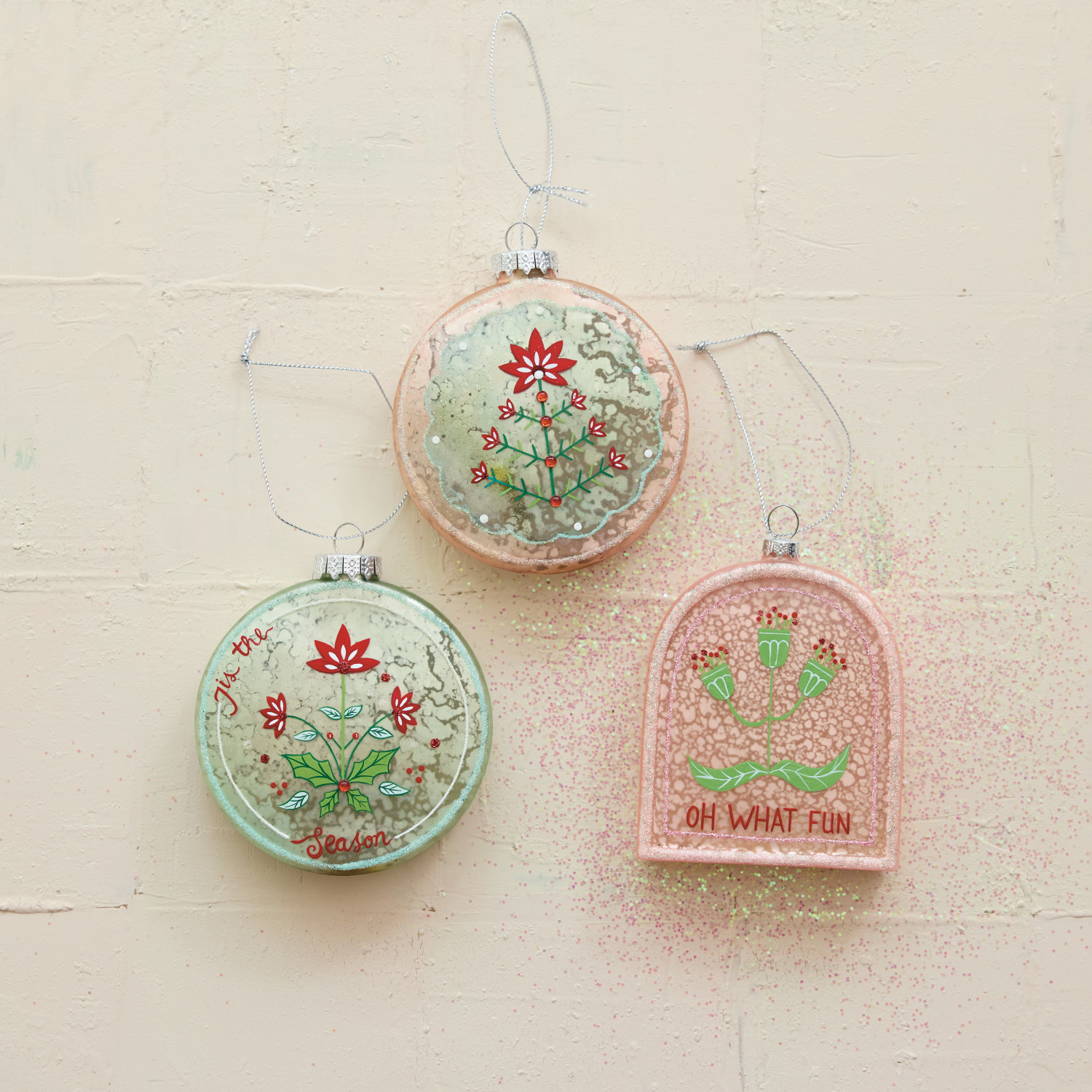 Catalog Name: 4-1/4"H Hand-Painted Mercury Glass Ornament w/ Holiday Botanicals, Saying & Glitter, Multi Color, 3 Styles ©