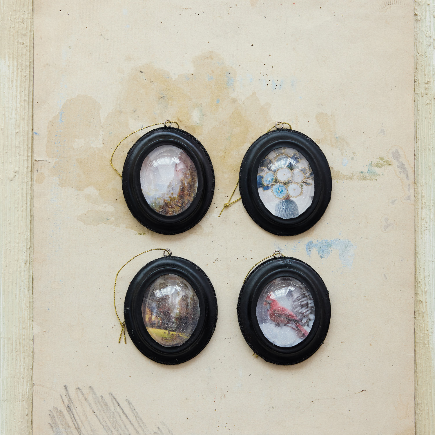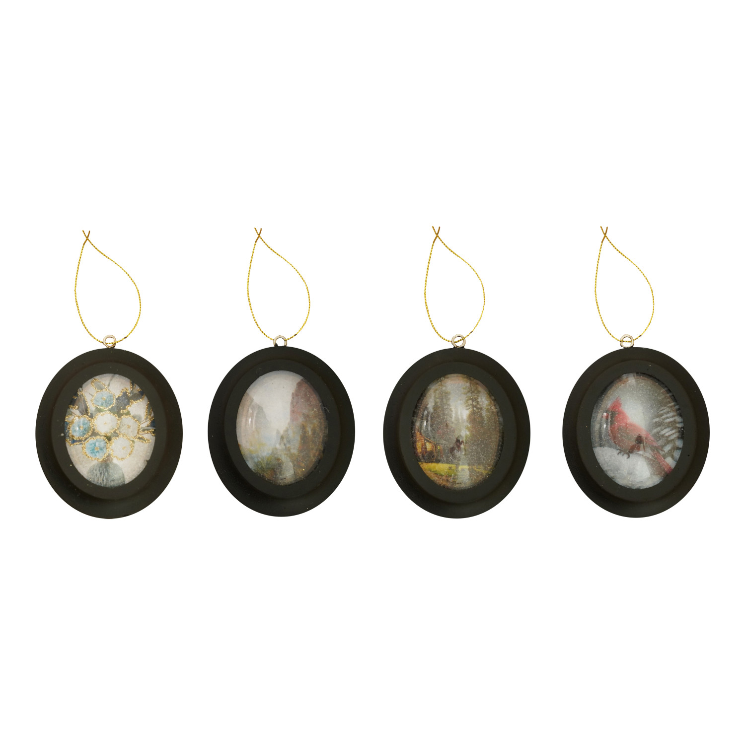 Catalog Name: 3-1/2"H Resin Convex Framed Ornament w/ Vintage Scene & Glitter, Multi Color, 4 Styles
