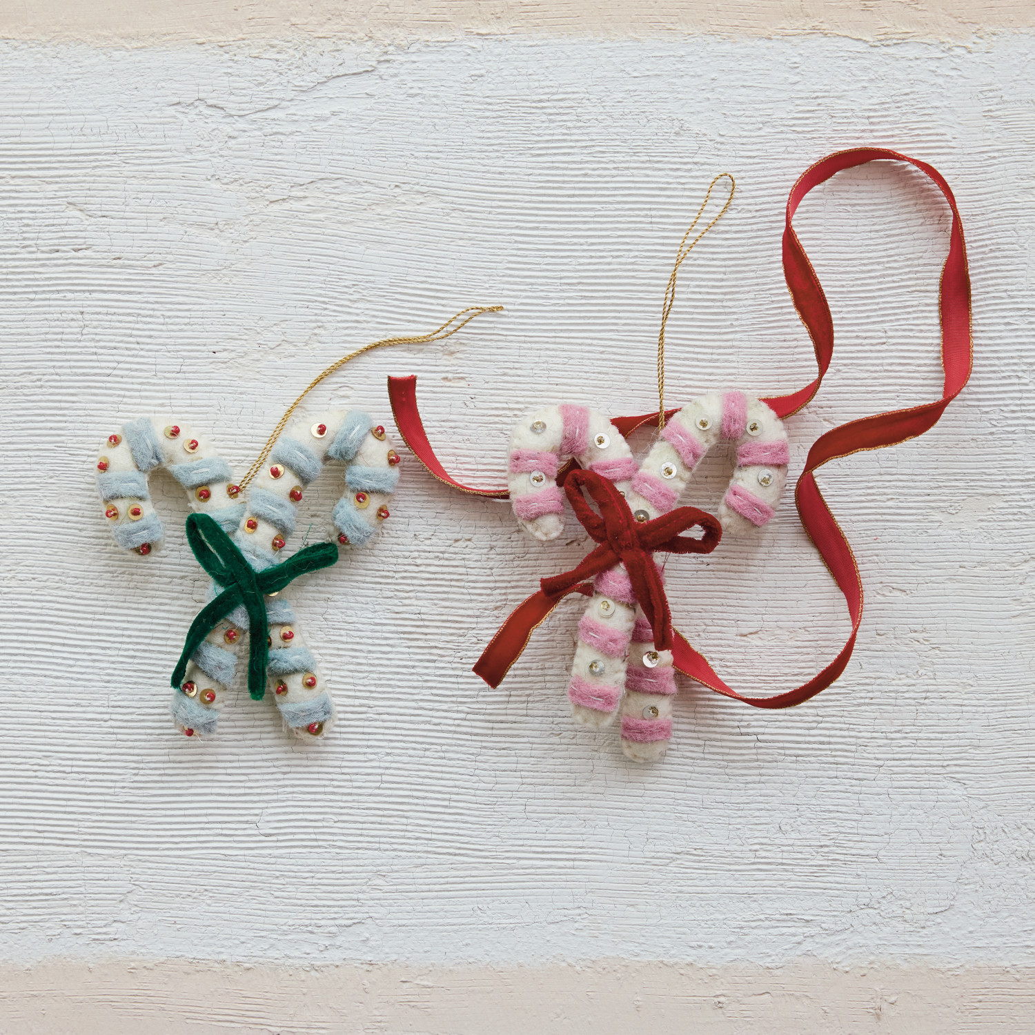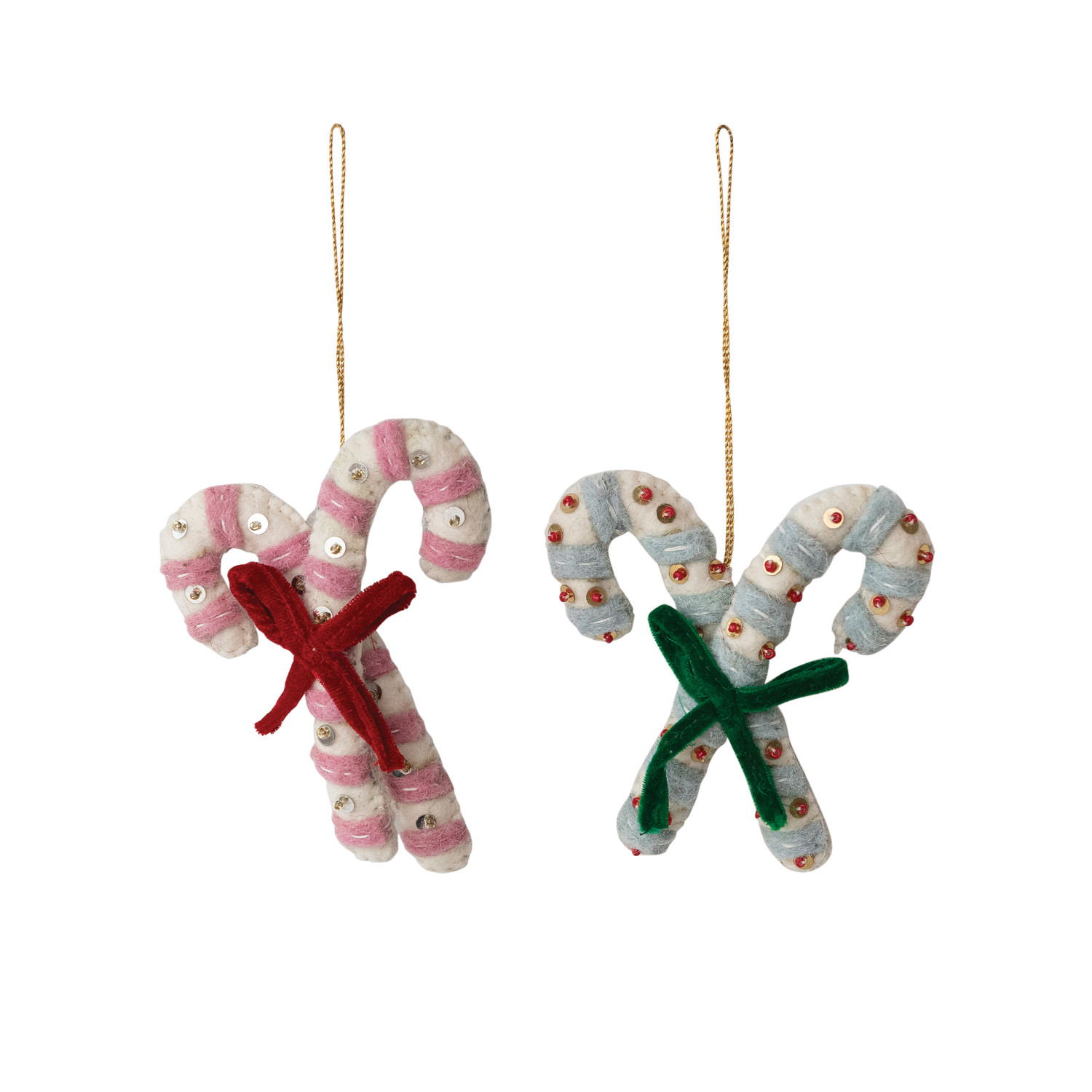 Handmade Wool Felt Candy Canes Ornament with Embroidery, Sequins & Bow, 2 Colors
