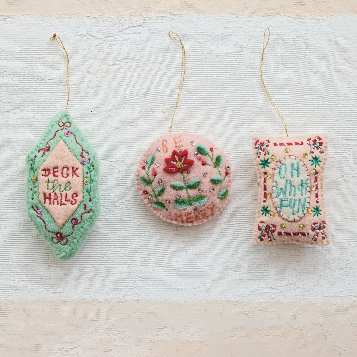 Catalog Name: 3-1/2"H - 5-3/4"H Handmade Wool Felt Ornament w/ Holiday Saying, Embroidery, Sequins & Glass Beads, Multi Color, 3 Styles ©