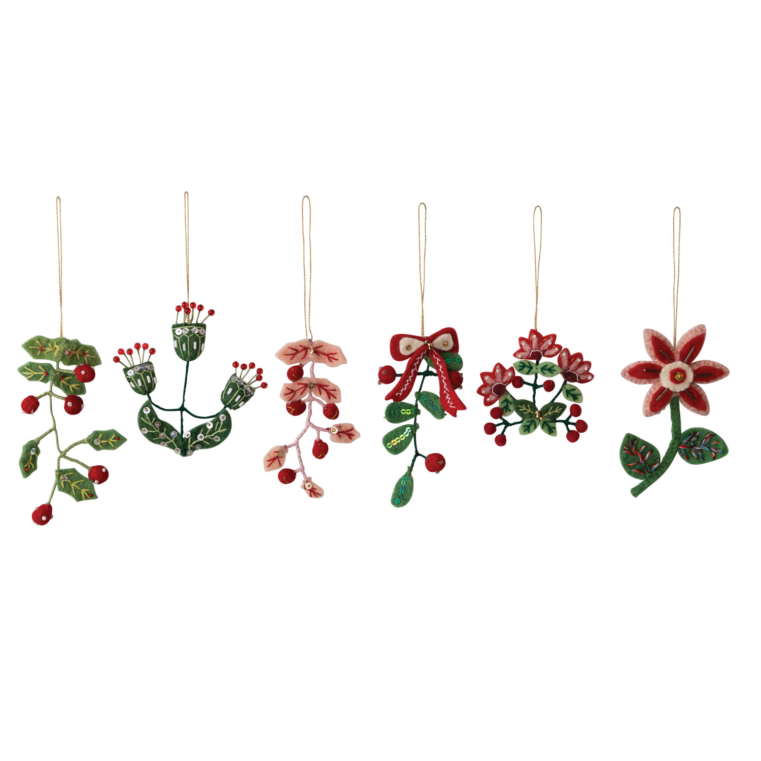 Catalog Name: 3-1/4"H - 5"H Handmade Wired Wool Felt Holiday Botanical Ornament w/ Embroidery, Sequins & Glass Beads, Multi Color, 6 Styles ©