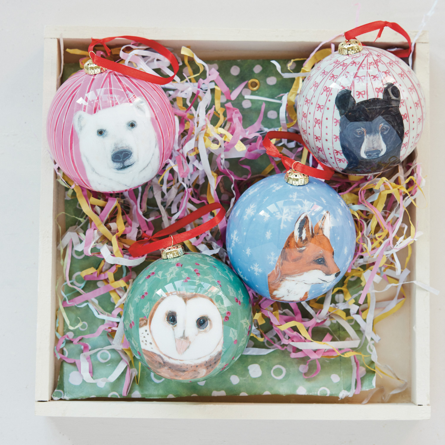 Handmade Decoupage Ball Ornament with Holiday Pattern & Animal, 4 Styles ©