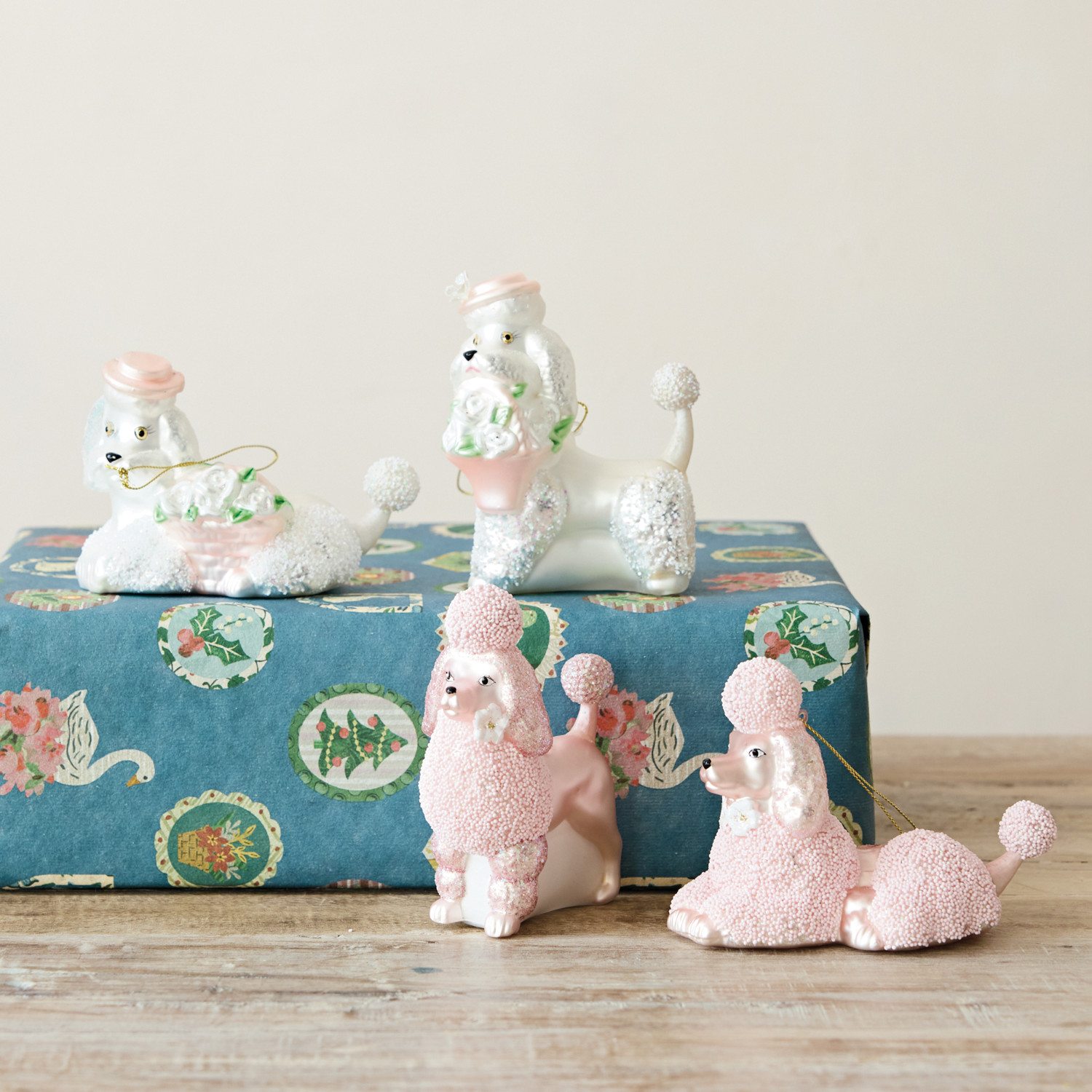 Catalog Name: 4-1/2"H - 3-1/4"H Hand-Painted Glass Vintage Reproduction Poodle Ornament w/ Glitter, White, Pink & Green, 2 Styles