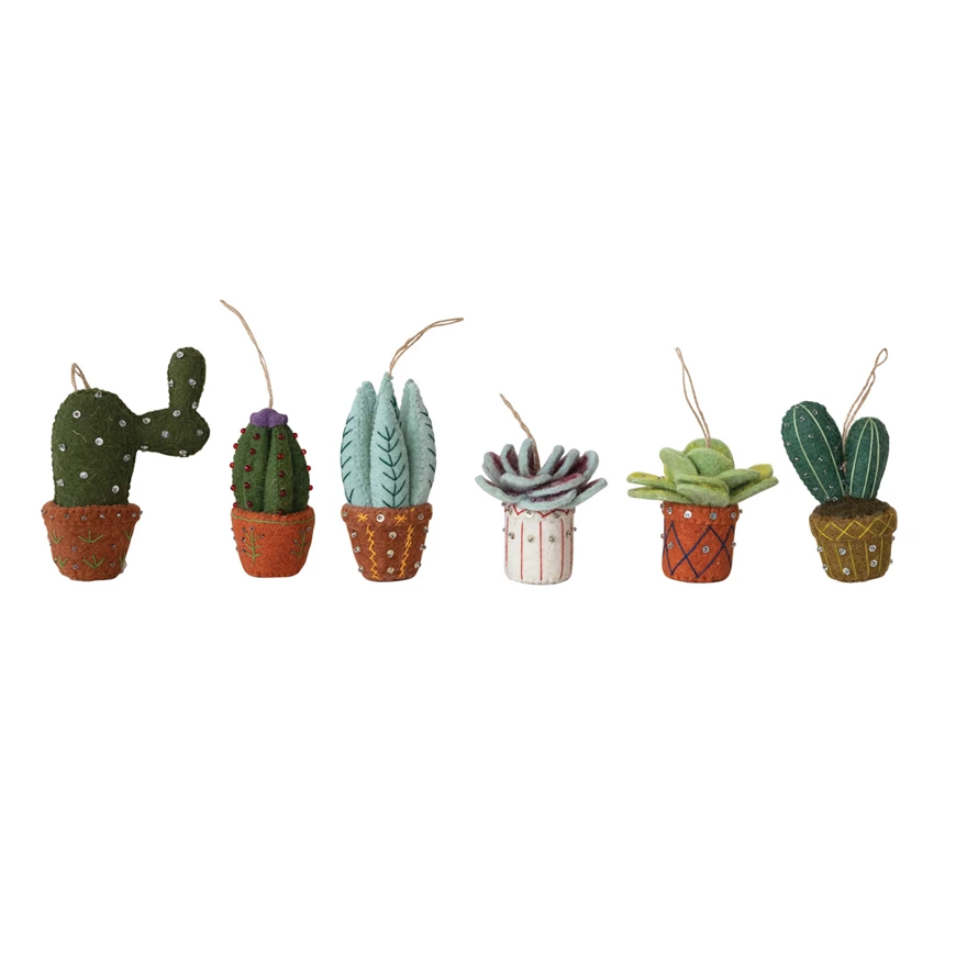 Catalog Name: 3-3/4"H - 6"H Handmade Wool Felt Cactus in Planter Ornament w/ Embroidery, Sequins & Beads, Multi Color, 6 Styles