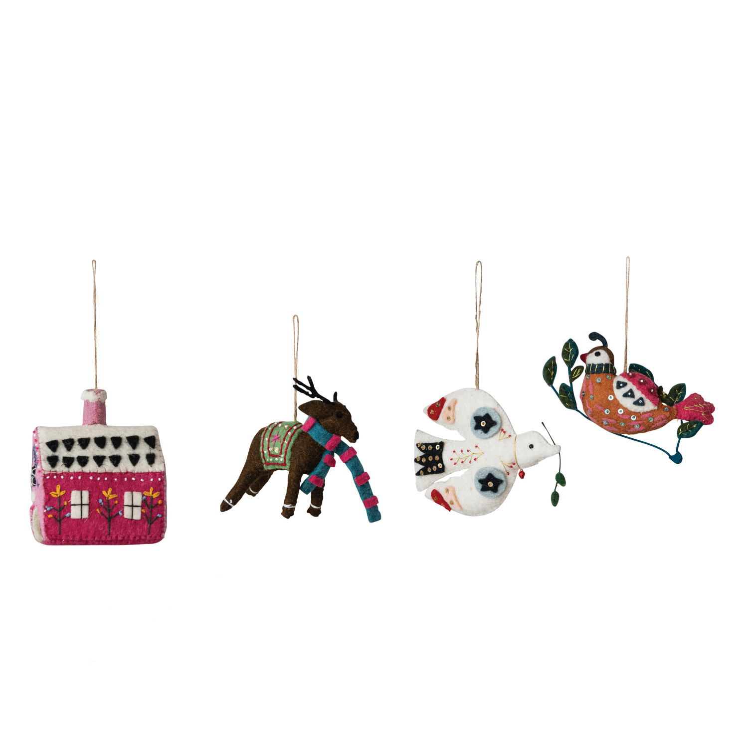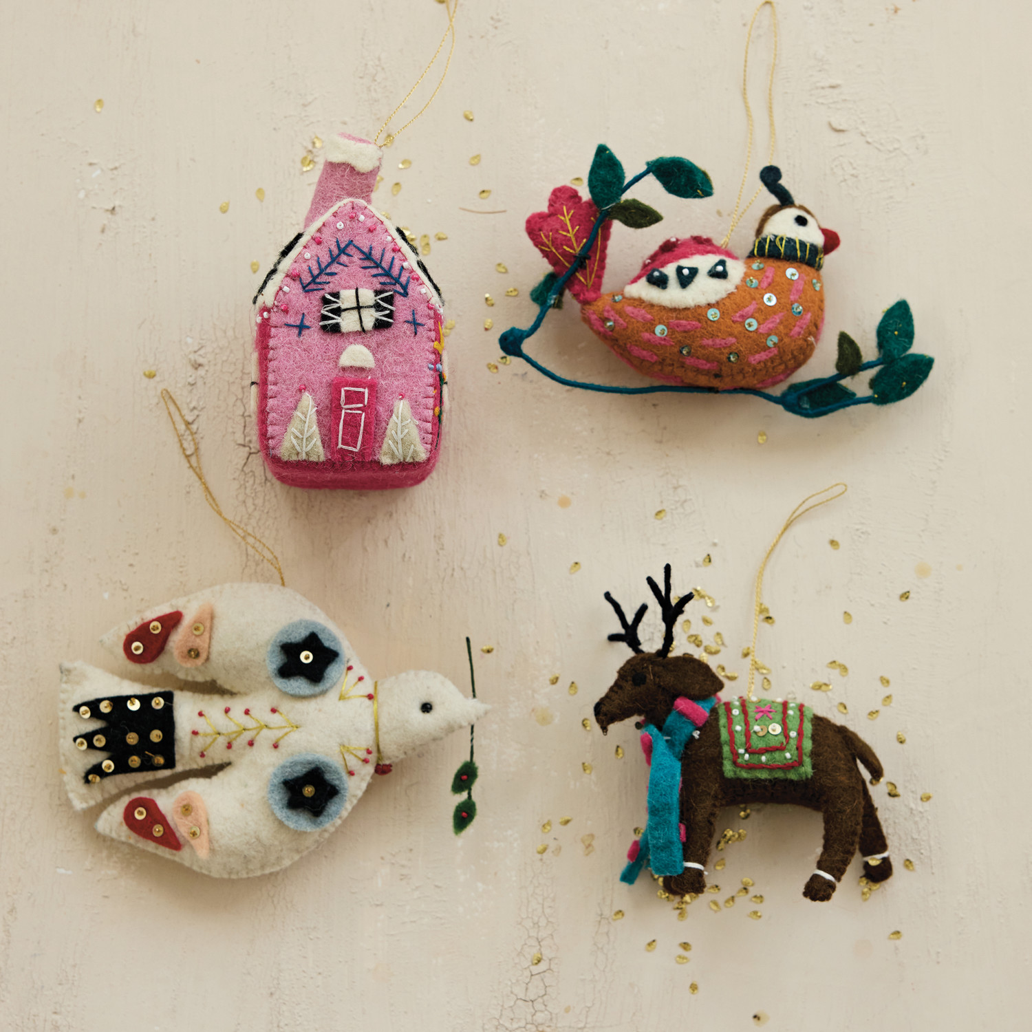 Catalog Name: 3-1/2"H - 5-1/2"H Handmade Wool Felt Animal/Cottage Ornament w/ Embroidery, Sequins & Beads, Multi Color, 4 Styles ©