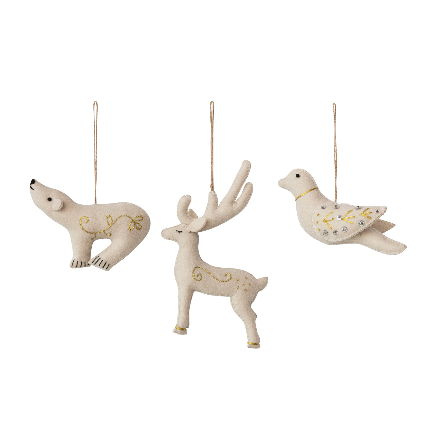 Catalog Name: 3-1/2"H - 5-1/2"H Handmade Wool Felt Animal Ornament w/ Metallic Gold Thread Embroidery, Sequins & Beads, Cream Color, 3 Styles