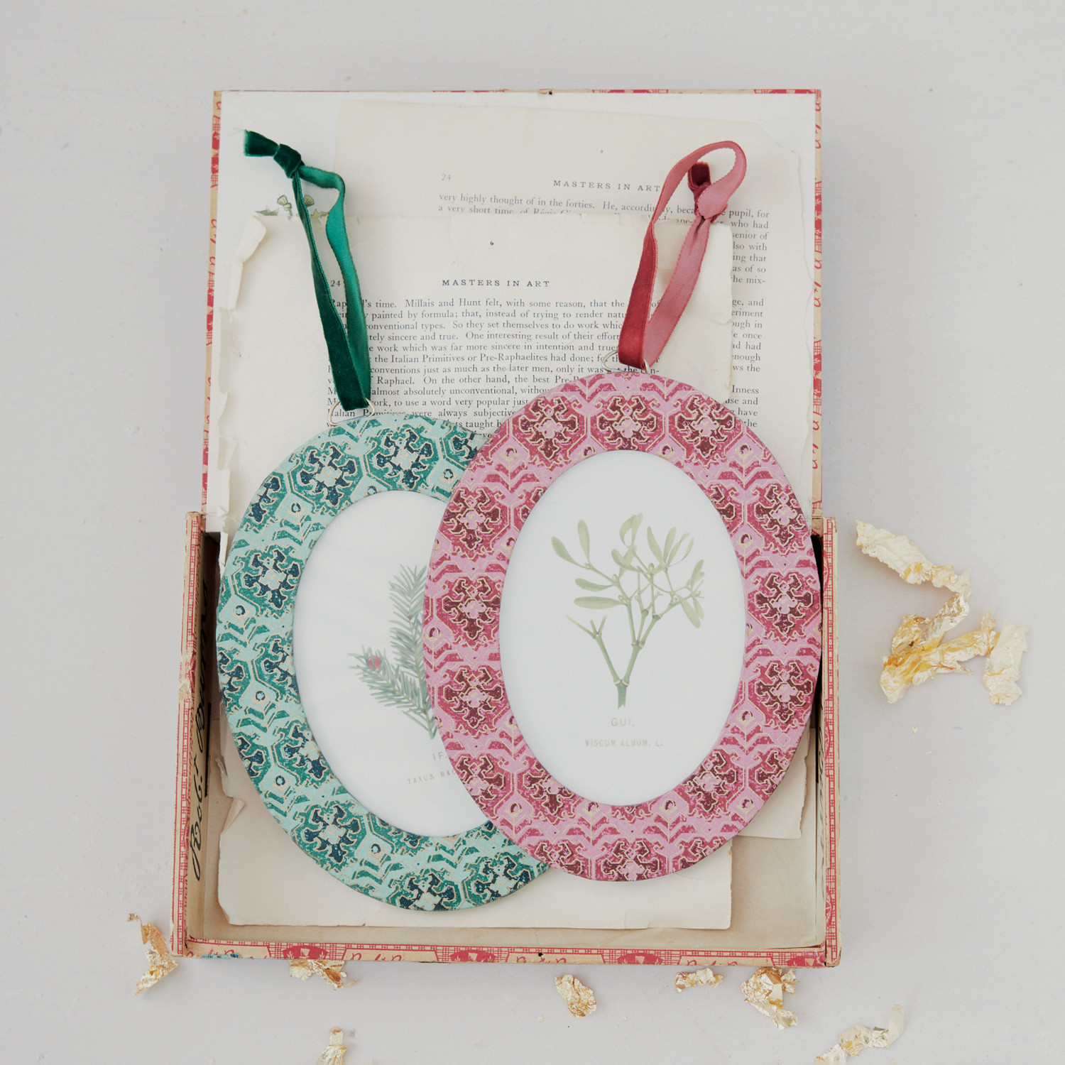Catalog Name: 6-3/4"H Oval Metal & Handmade Recycled Block Printed Paper Photo Frame Ornament w/ Pattern & Velvet Ribbon Hanger, 2 Styles