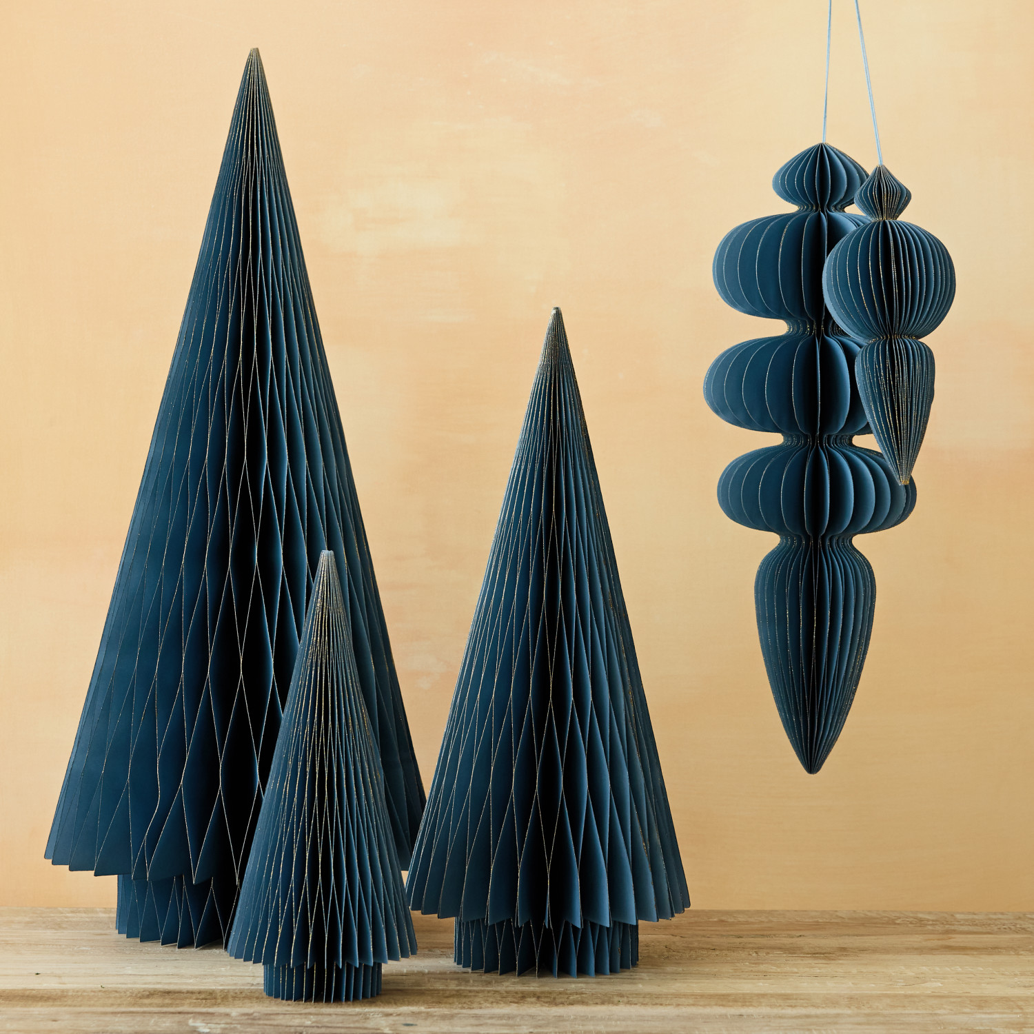 Catalog Name: 6-1/2" Round x 18"H Oversized Handmade Recycled Paper Folding Honeycomb Finial Ornament w/ Gold Glitter Edges, Blue