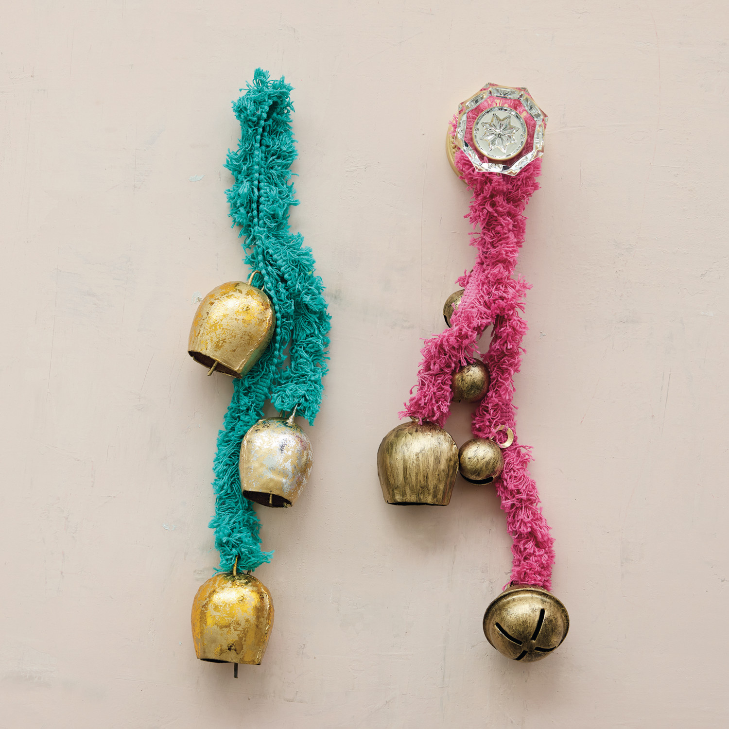 Catalog Name: 10"H Handmade Hanging Metal Bells w/ Frayed Cotton Hanger, Gold Finish & Turquoise Color