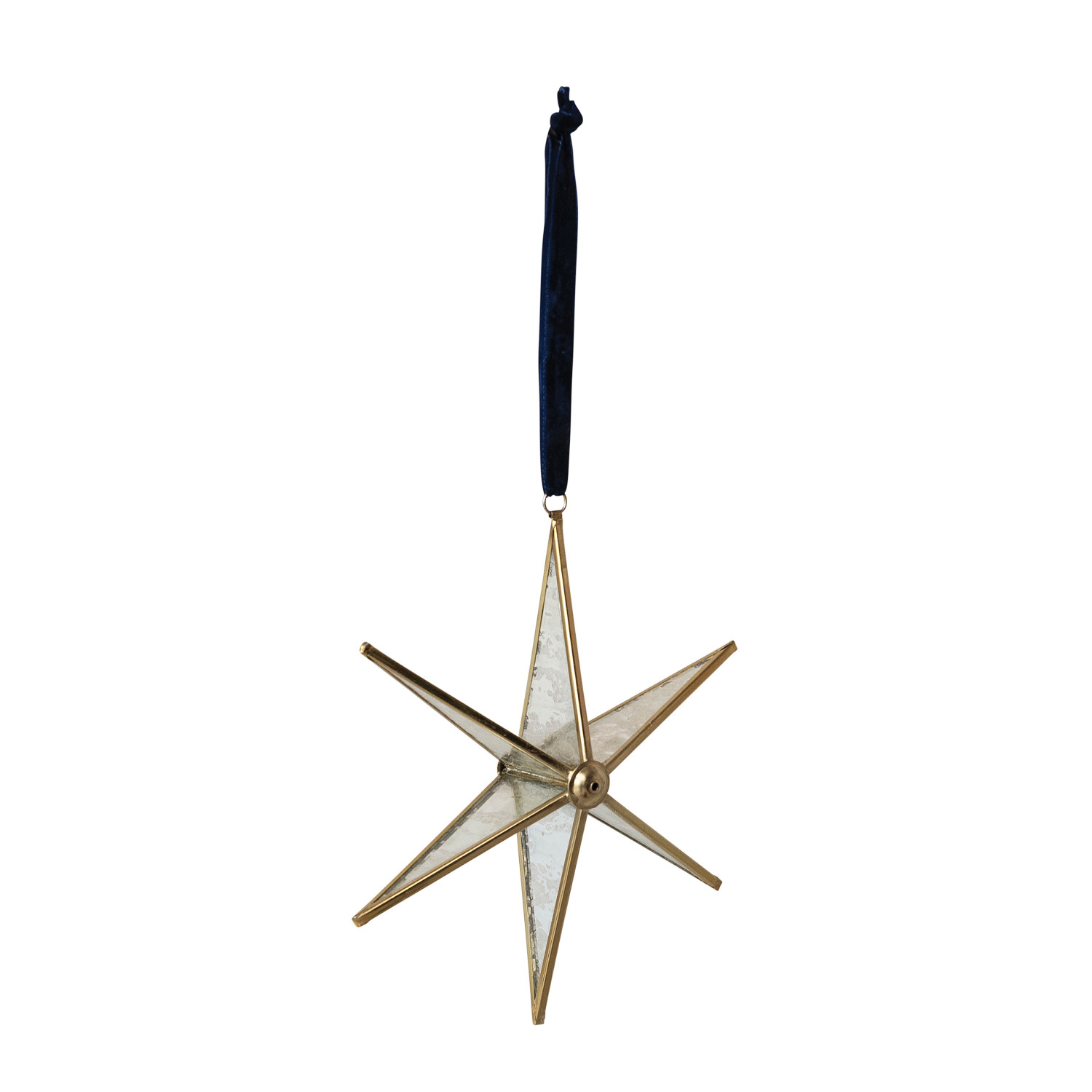 Catalog Name: 6-1/2"L x 1-3/4"W x 6-1/2"H Handmade Antique Mirrored Glass & Brass Star Ornament w/ Blue Velvet Ribbon Hanger, Gold Finish