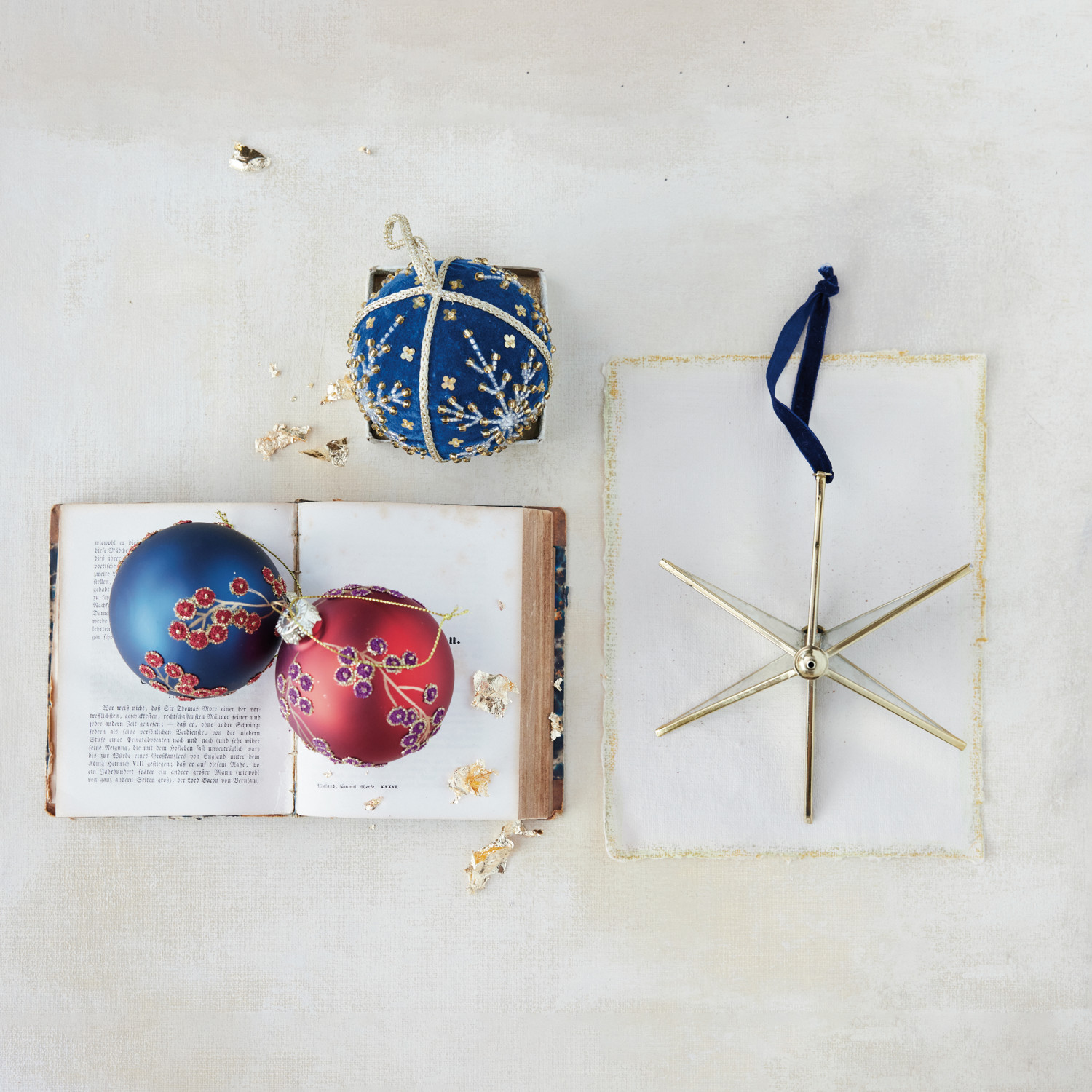 Handmade Antique Mirrored Glass & Brass Star Ornament with Blue Velvet Ribbon Hanger