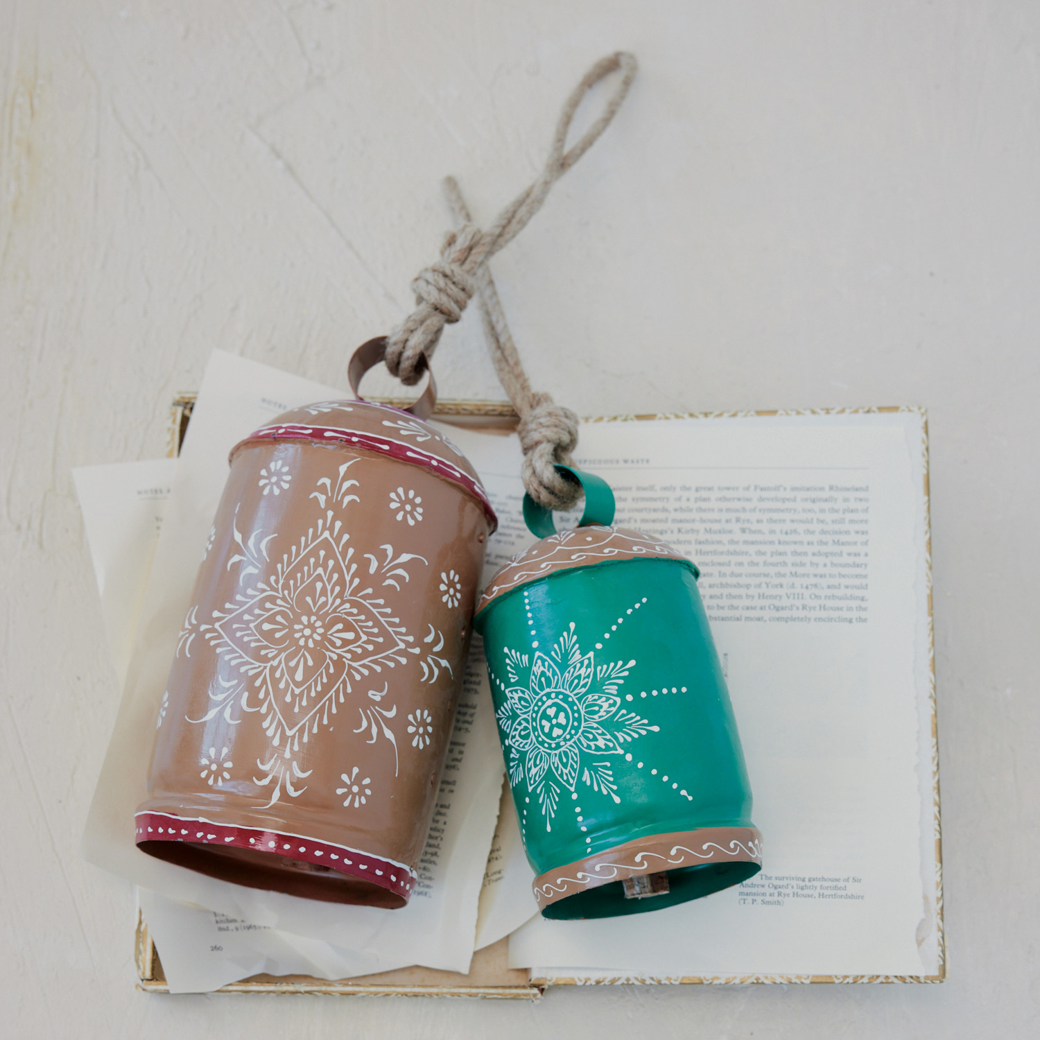 Hand-Painted Metal & Mango Wood Bell with Design & Jute Hanger, Tan Color, White & Red