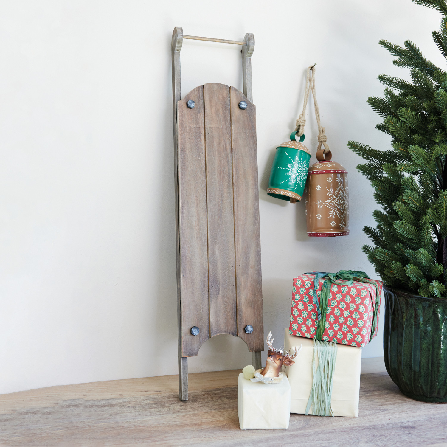 Catalog Name: 9"H Hand-Painted Metal & Mango Wood Bell w/ Design & Jute Hanger, Tan Color, White & Red