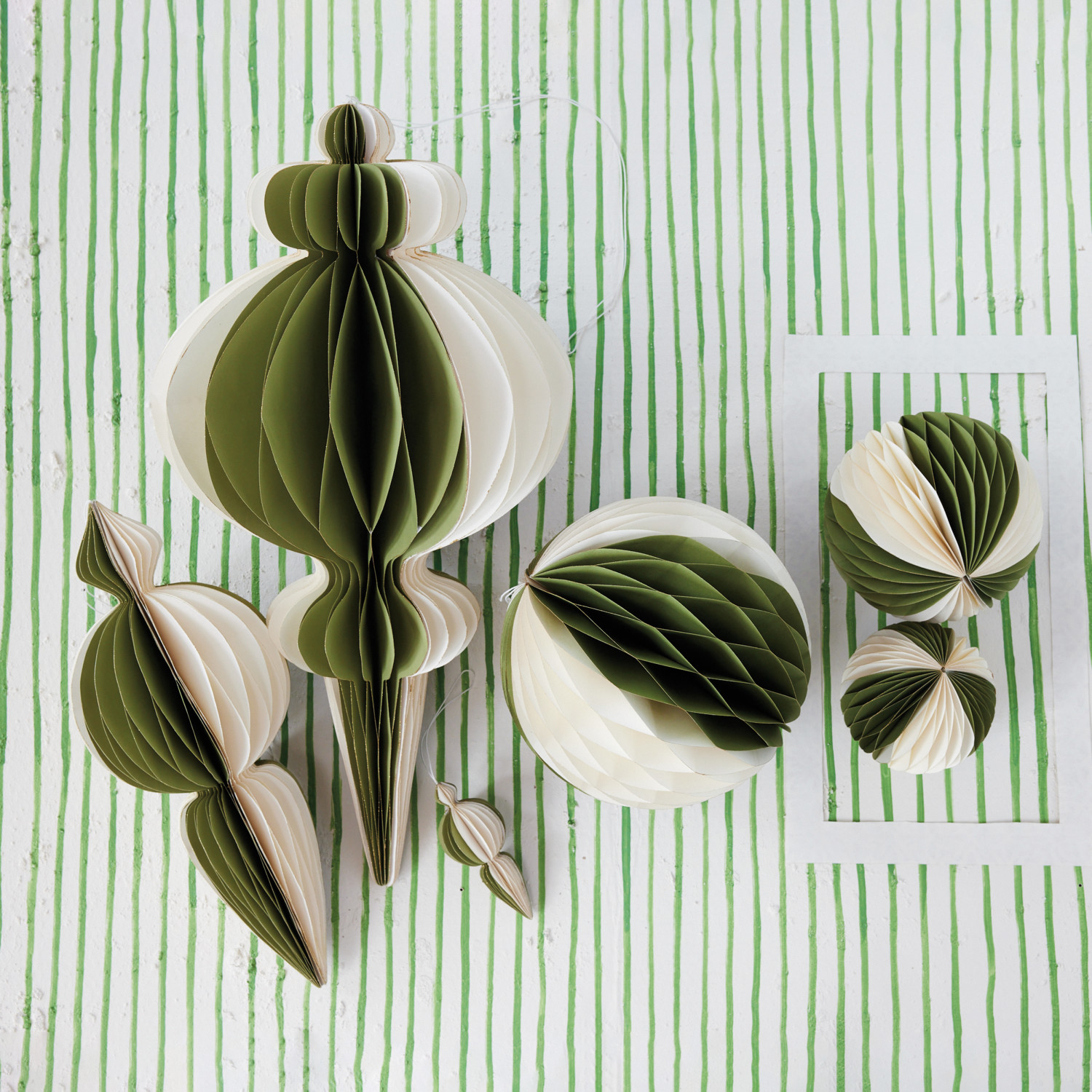 Catalog Name: 5" Round Handmade Recycled Paper Folding Honeycomb Ball Ornament w/ Gold Glitter Edges, Green & Ivory Color