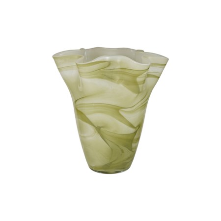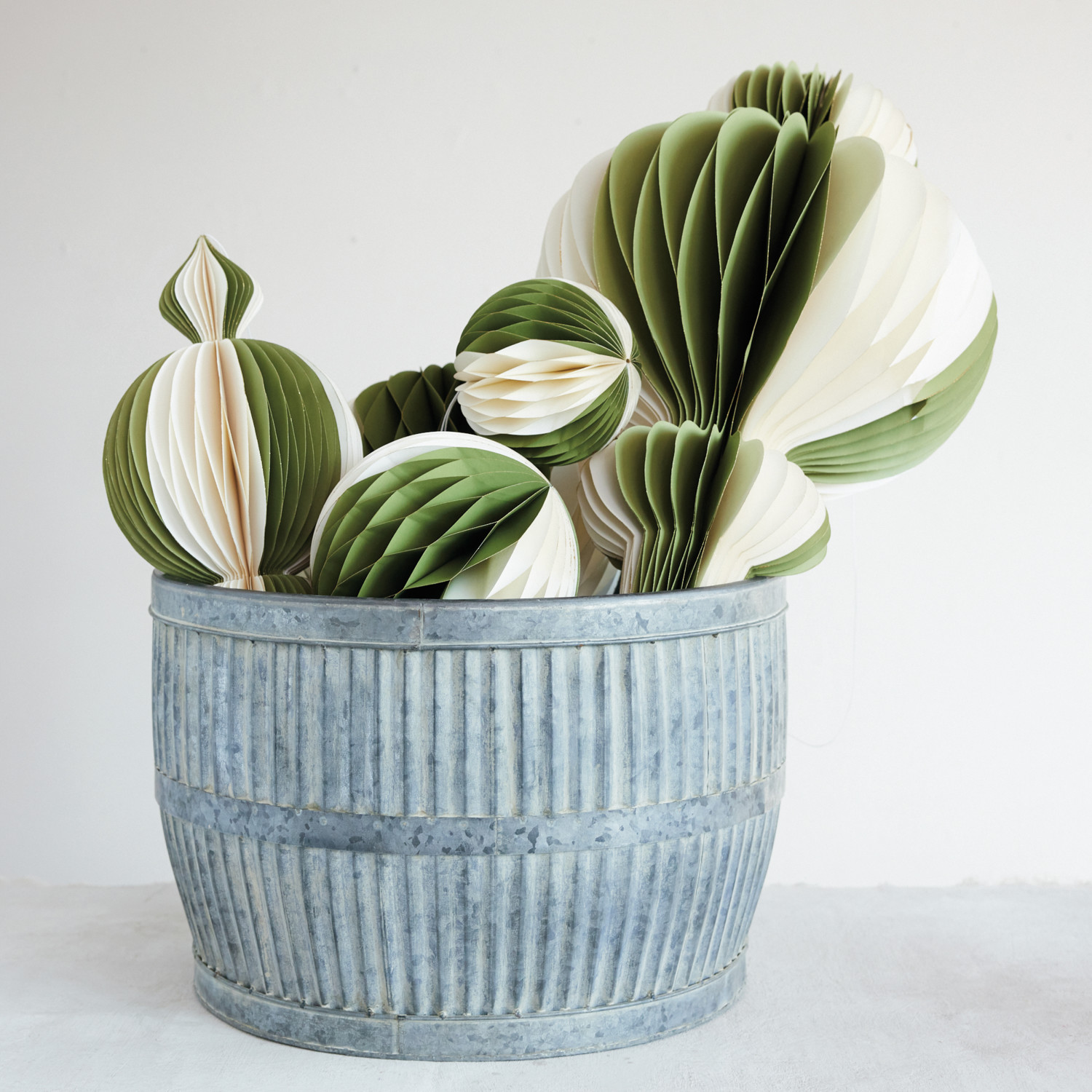 Catalog Name: 13" Round x 26"H Oversized Handmade Recycled Paper Folding Honeycomb Finial Ornament w/ Gold Glitter Edges, Green & Ivory Color
