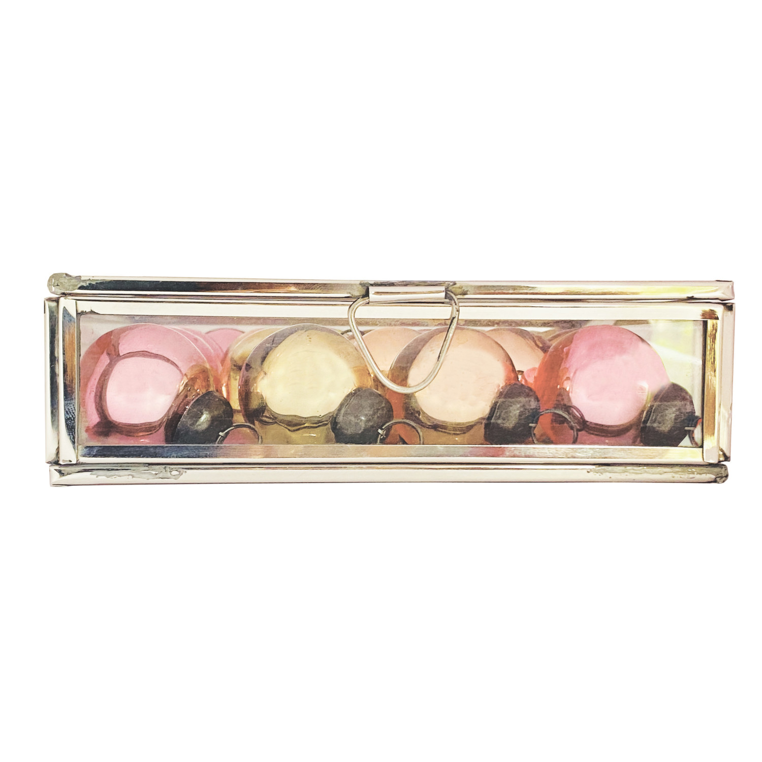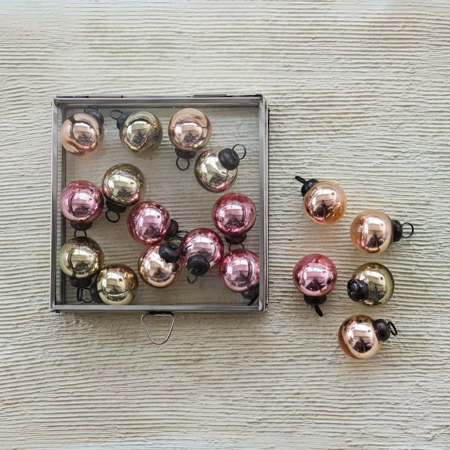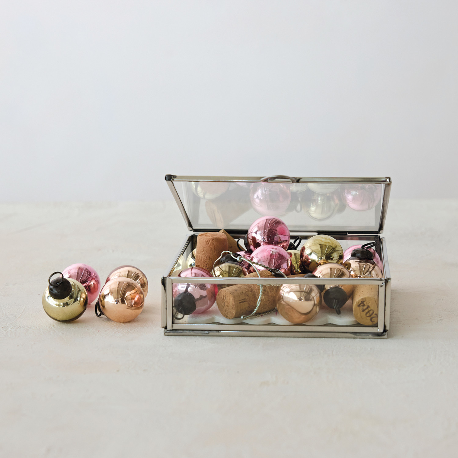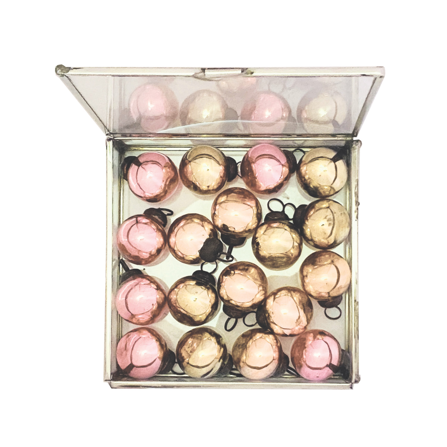 Catalog Name: 1-1/4"H (18) Mercury Glass Ornaments in 6" Square x 1-3/4"H Stainless Steel & Glass Display Box, Nickel Finish, Copper Color, Green & Pink, Set of 19