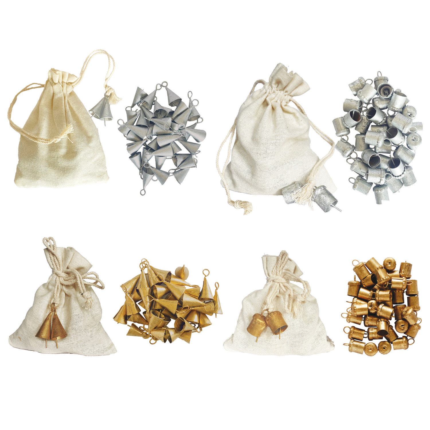 Metal Bells, Set of 36 in Drawstring Bag, 2 Styles, 2 Finishes