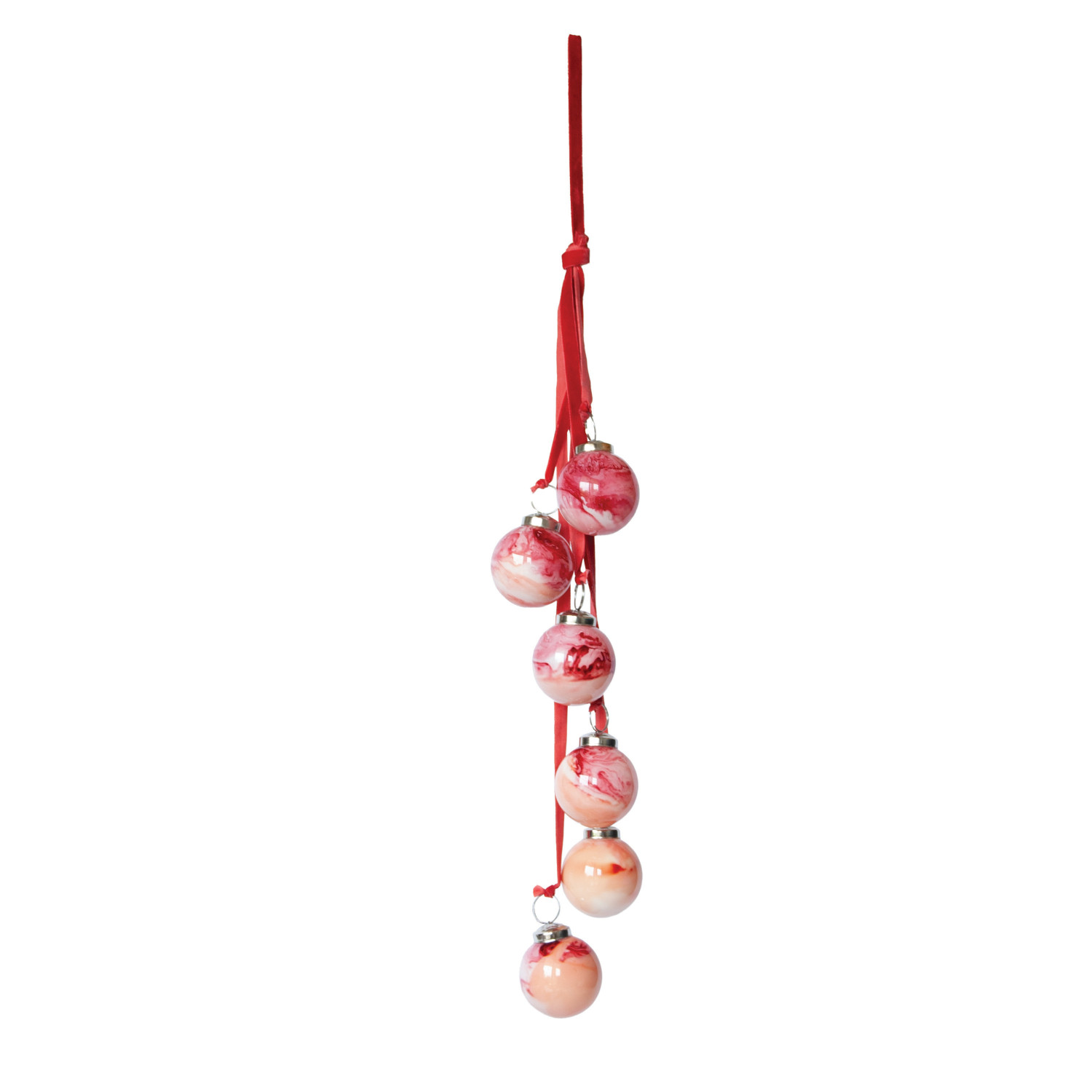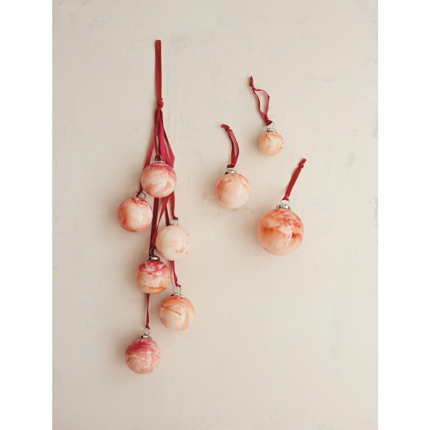 Glass Ornament Cluster with Velvet Ribbon, Marbled Pink & Red