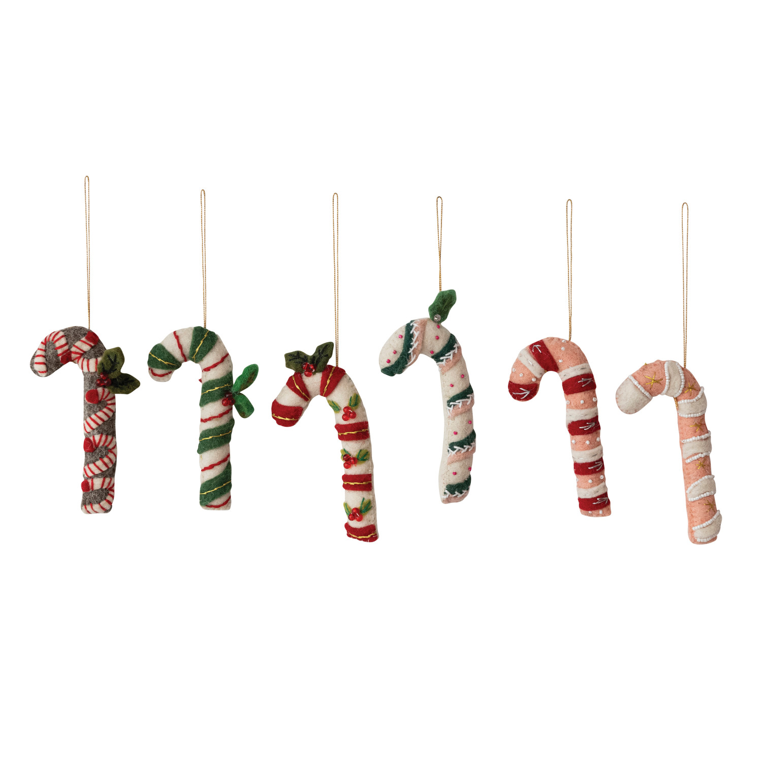 Catalog Name: 5"H Handmade Wool Felt Candy Cane Ornament w/ Applique, Embroidery & Beads, Multi Color, 6 Styles