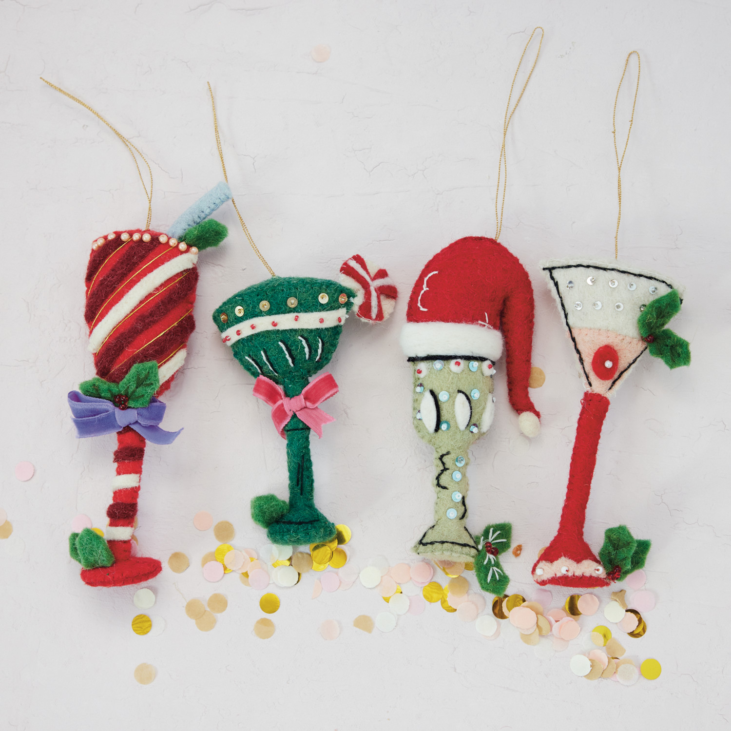 Handmade Wool Felt Holiday Cocktail Ornament with Embroidery, Sequins & Beads, 4 Styles ©