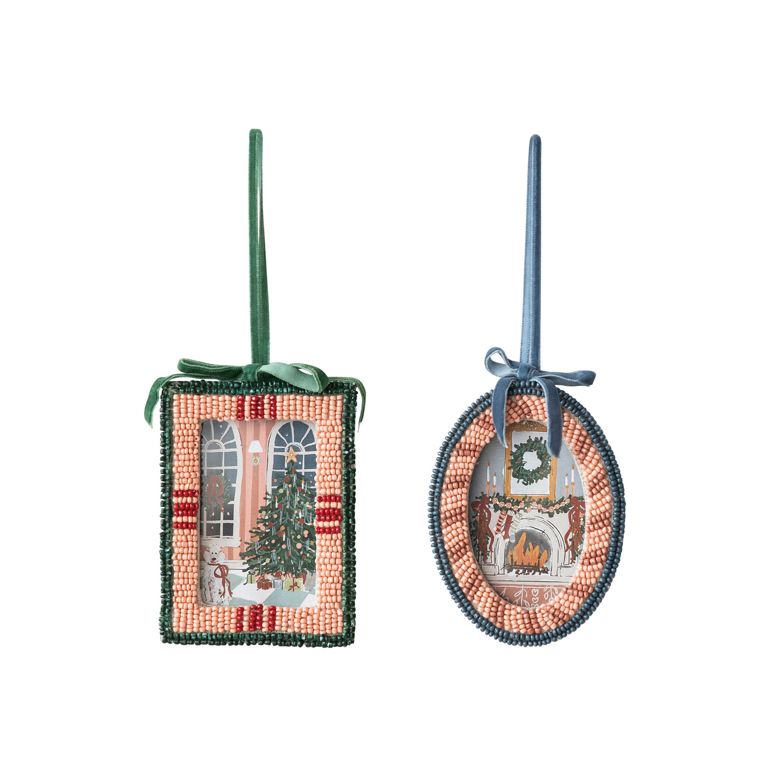 Glass Beaded Photo Frame Ornament with Velvet Bow & Hanger, 2 Styles ©