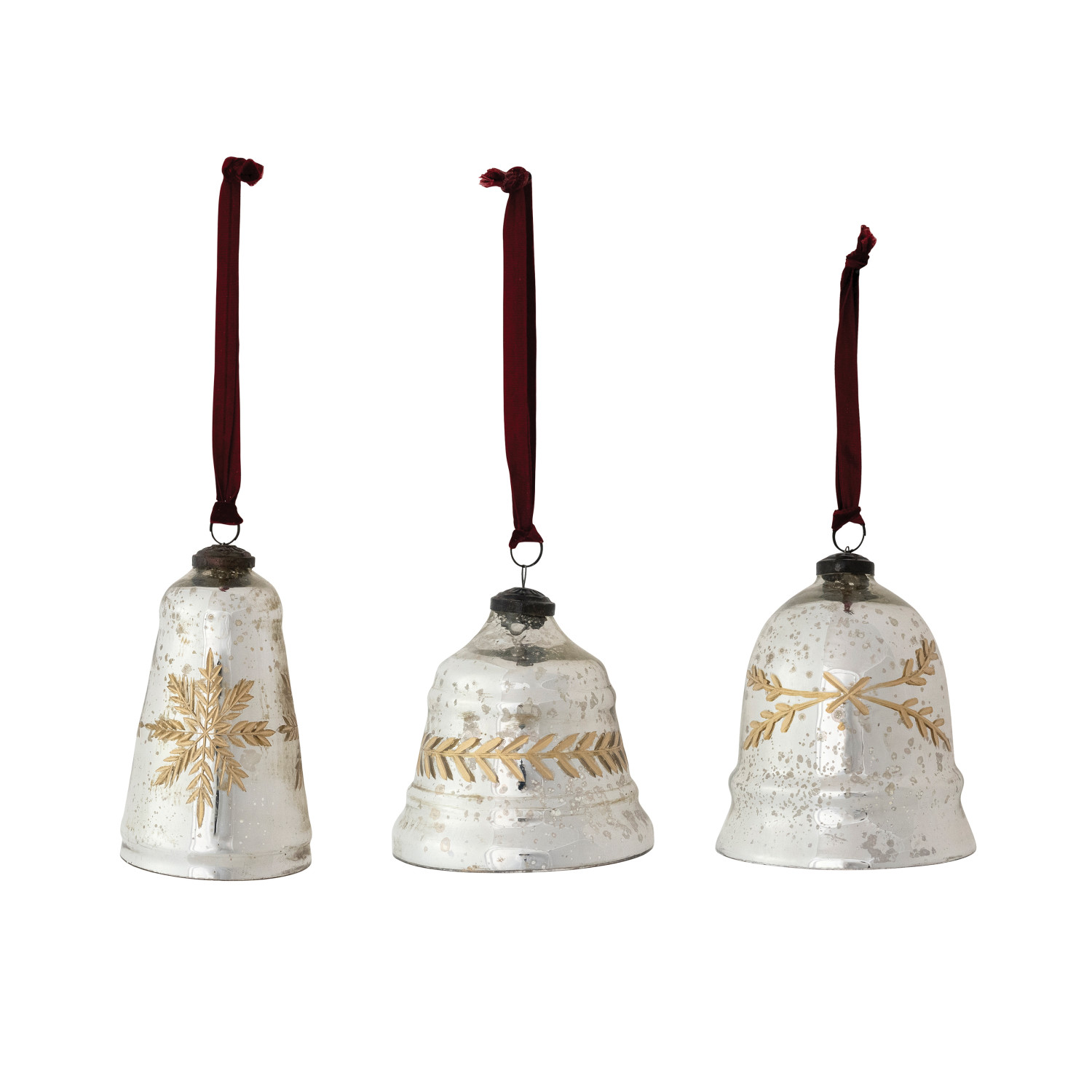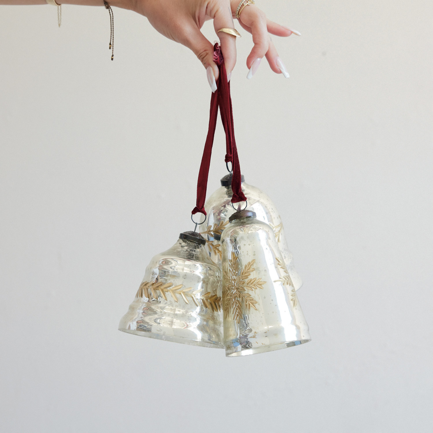 Etched Mercury Glass Bell Shaped Ornament with Burgundy Velvet Ribbon Hanger, 3 Styles