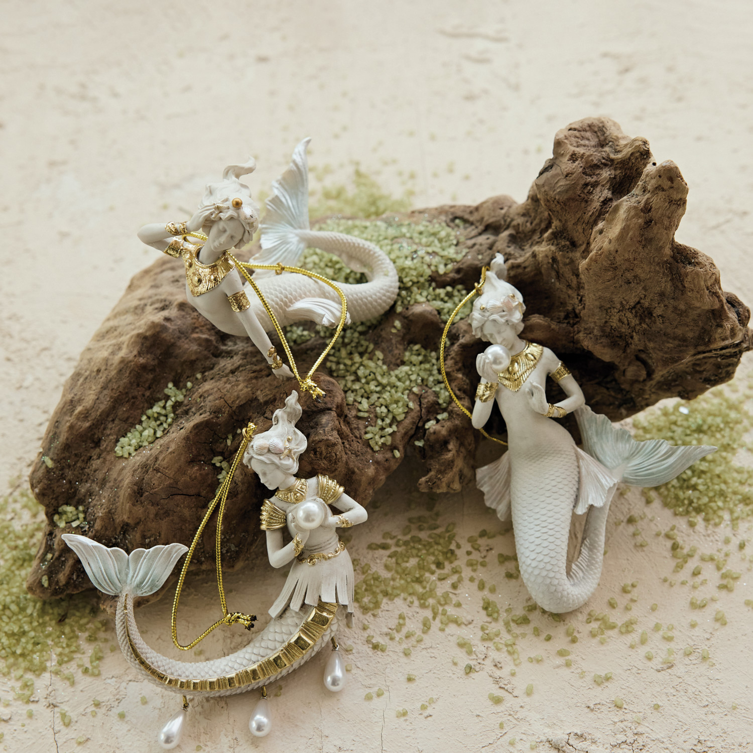 Catalog Name: 4-3/4"H - 6-1/4"H Resin Mermaid Ornament w/ Faux Pearls, White & Gold Finish, 3 Styles