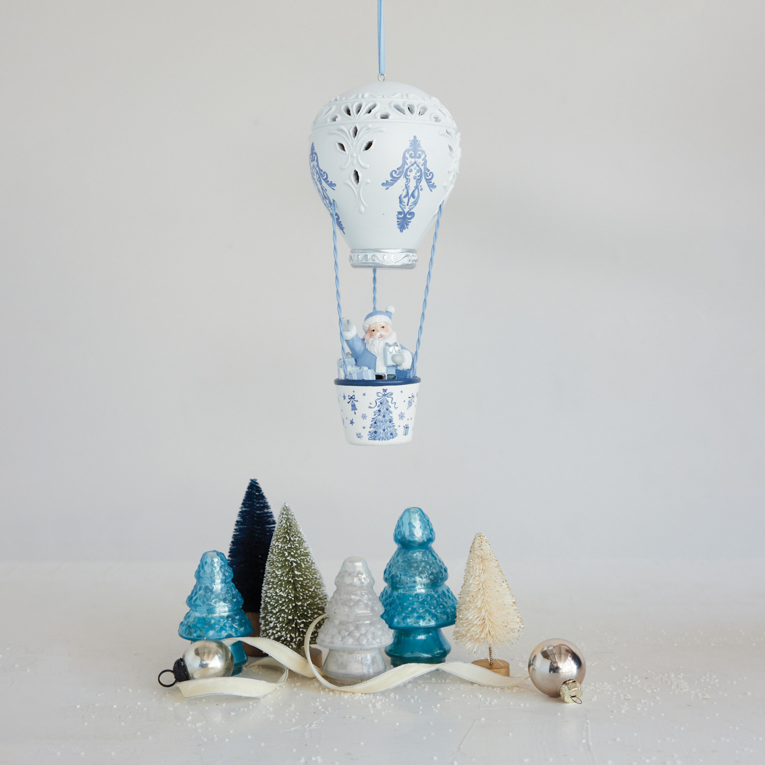 Catalog Name: 9-1/4"H Resin Hot Air Balloon Ornament w/ Design, Santa, Gifts & Tree, White & Blue