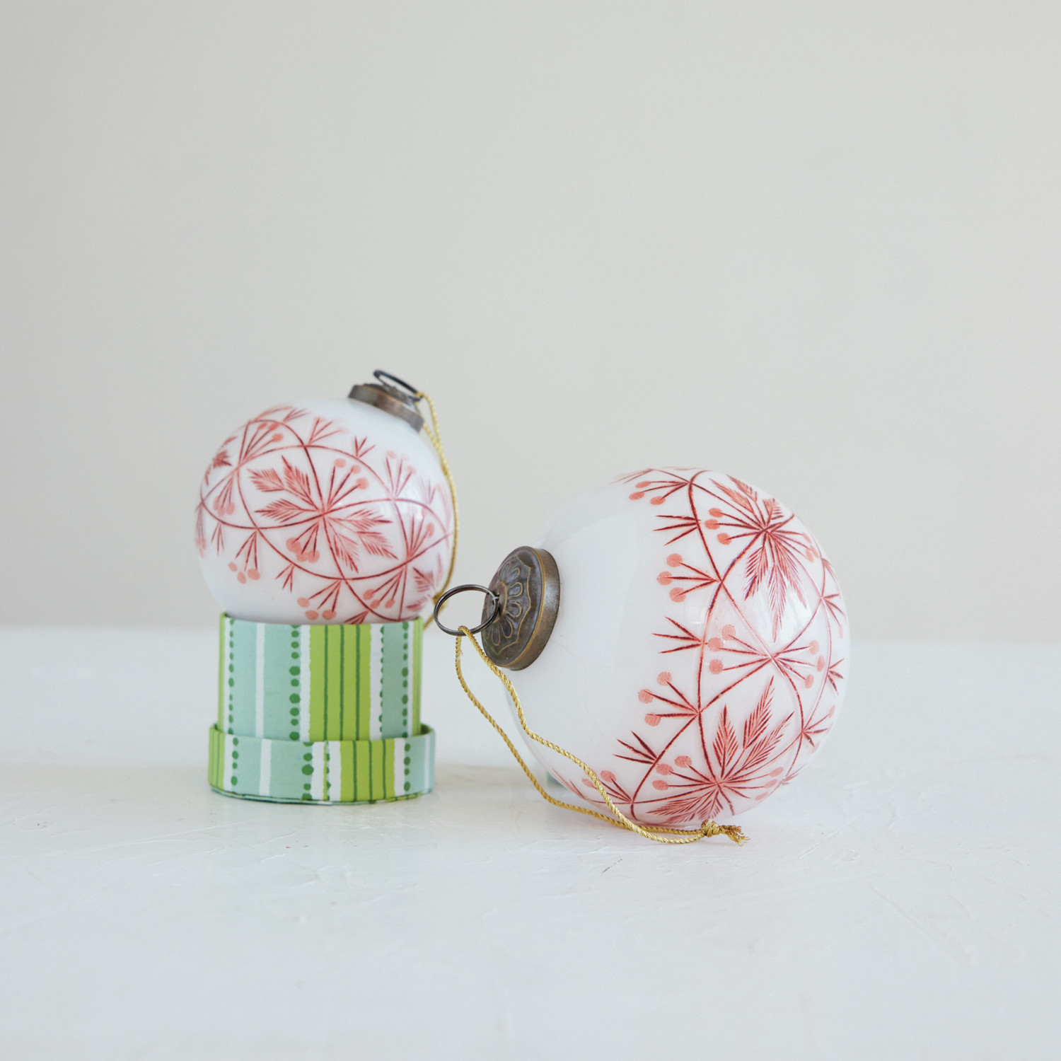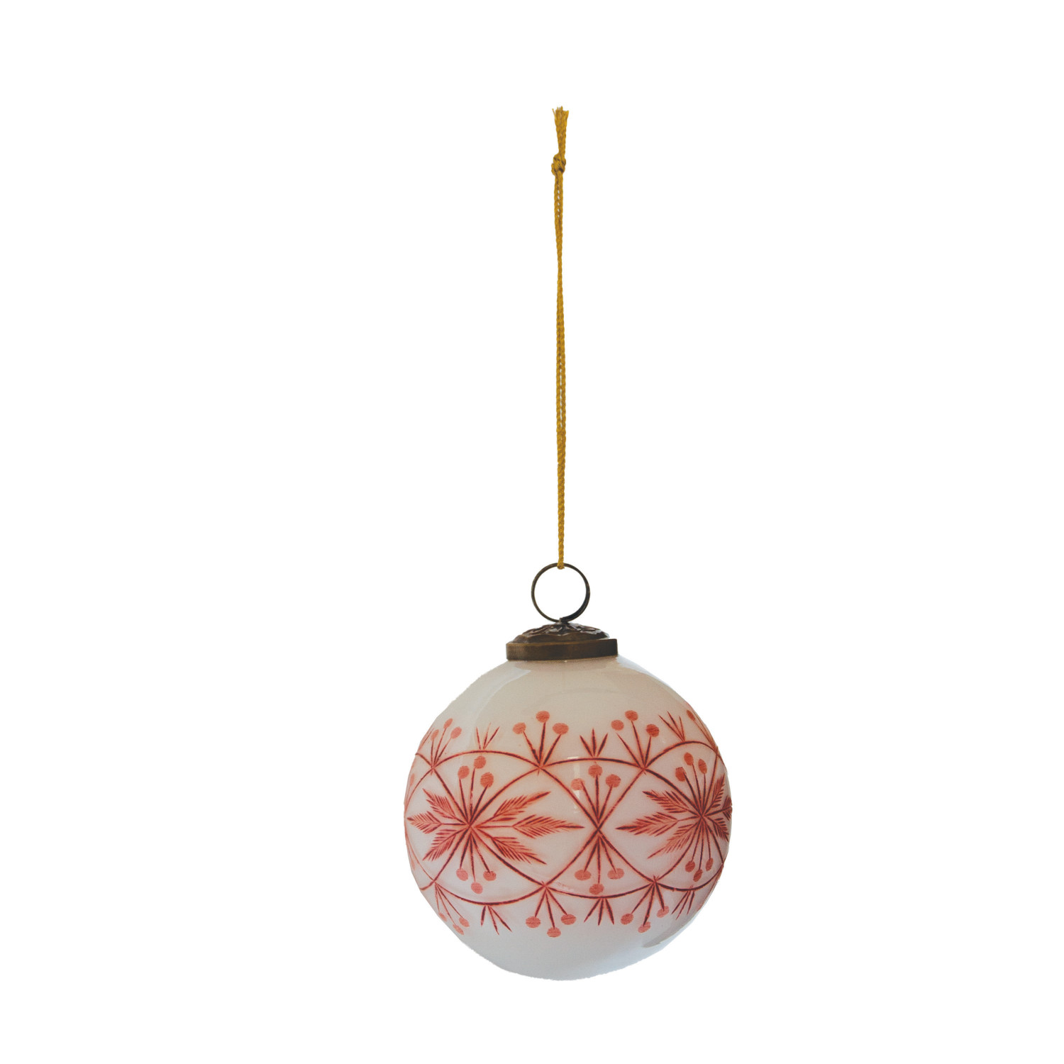 Hand-Blown Etched Glass Ball Ornament with Design, White & Red