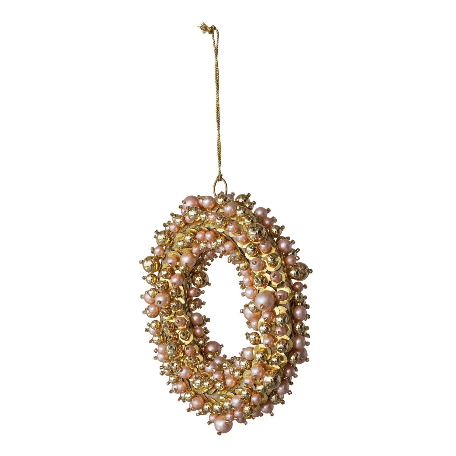 Faux Pearl & Glass Beaded Wreath Ornament with Sequins, Gold Finish & Pink
