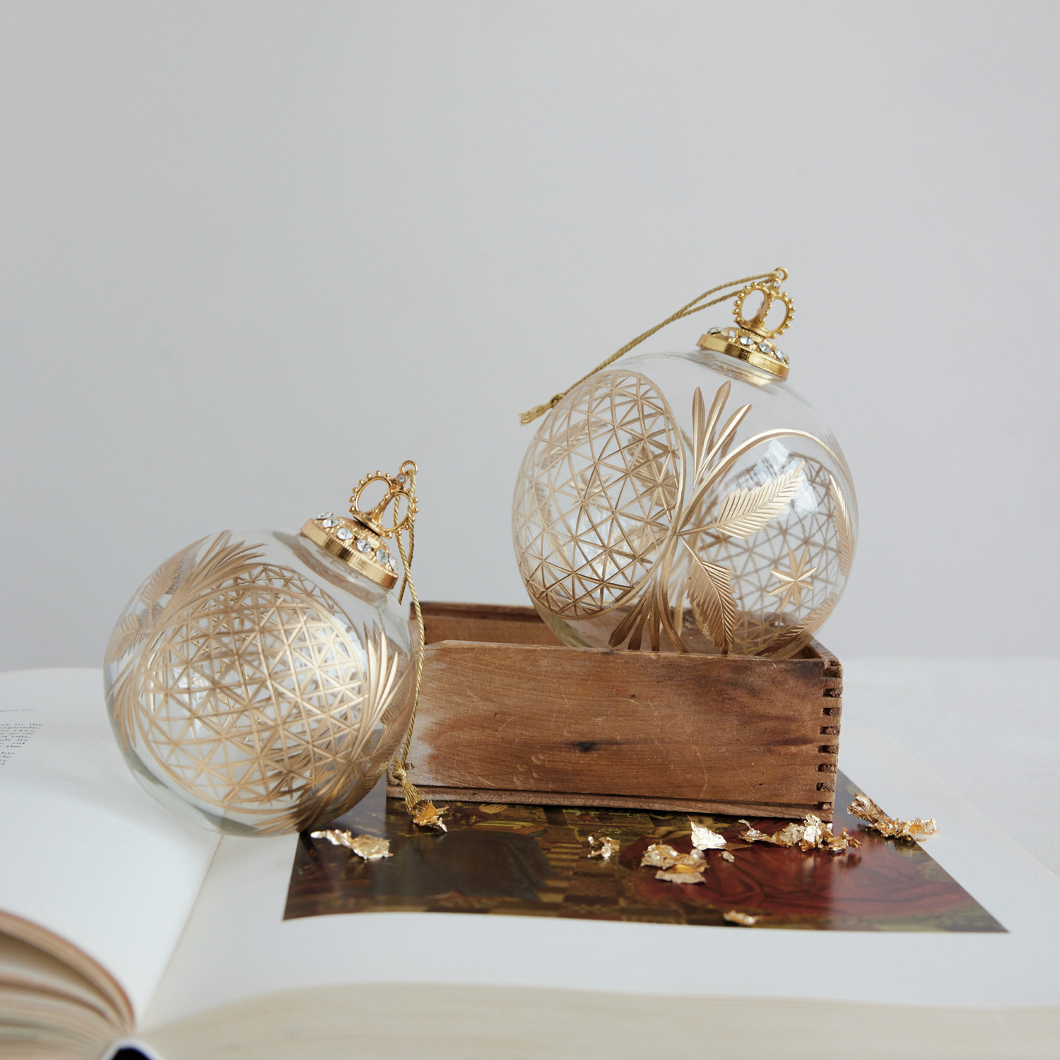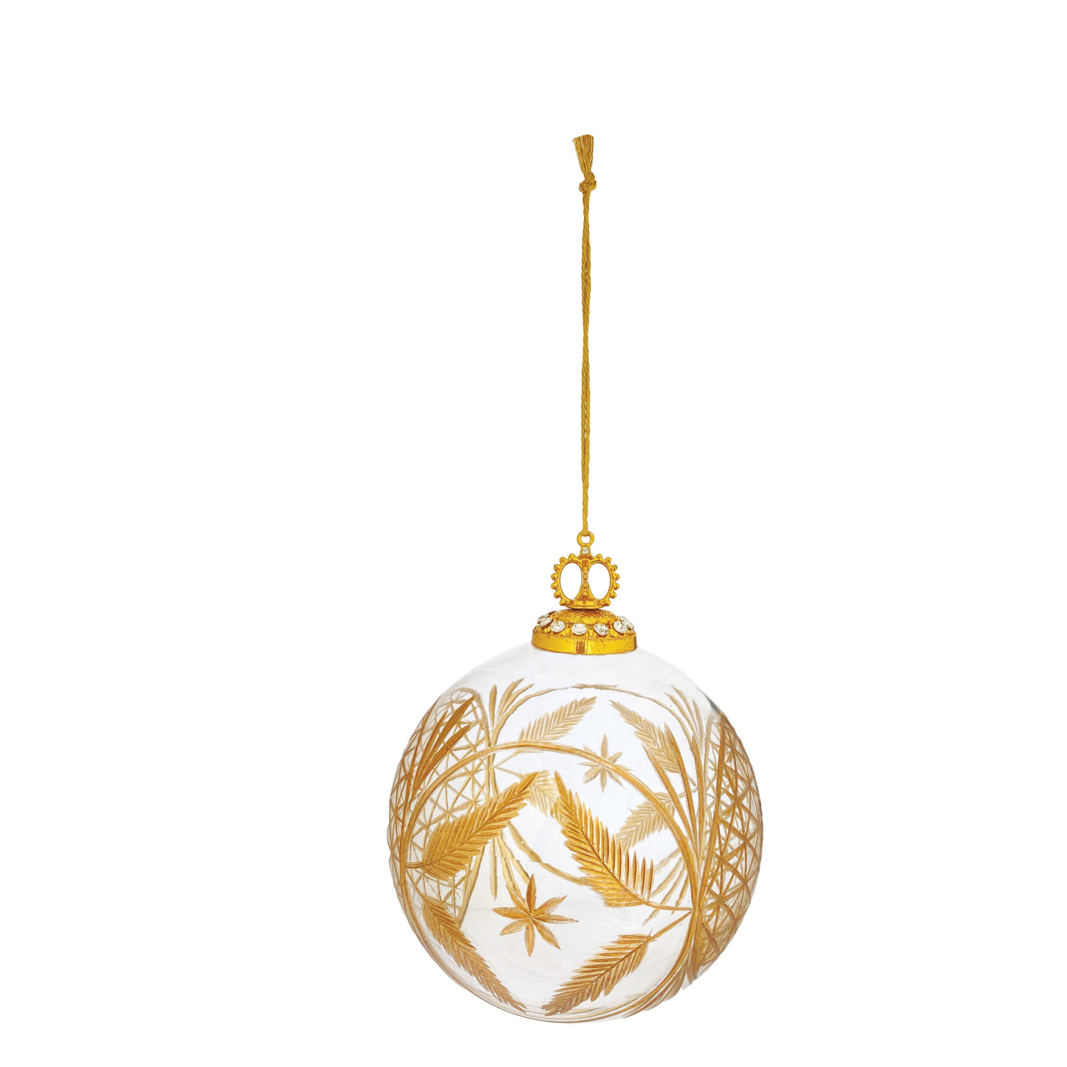 Hand-Blown Etched Glass Ball Ornament with Design, Gold Finish
