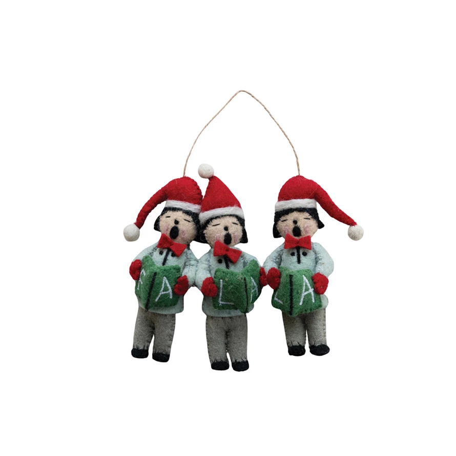 Catalog Name: 6"L x 6-1/2"H Wool Felt Carolers in Santa Hats Ornament "Fa La La", Multi Color ©