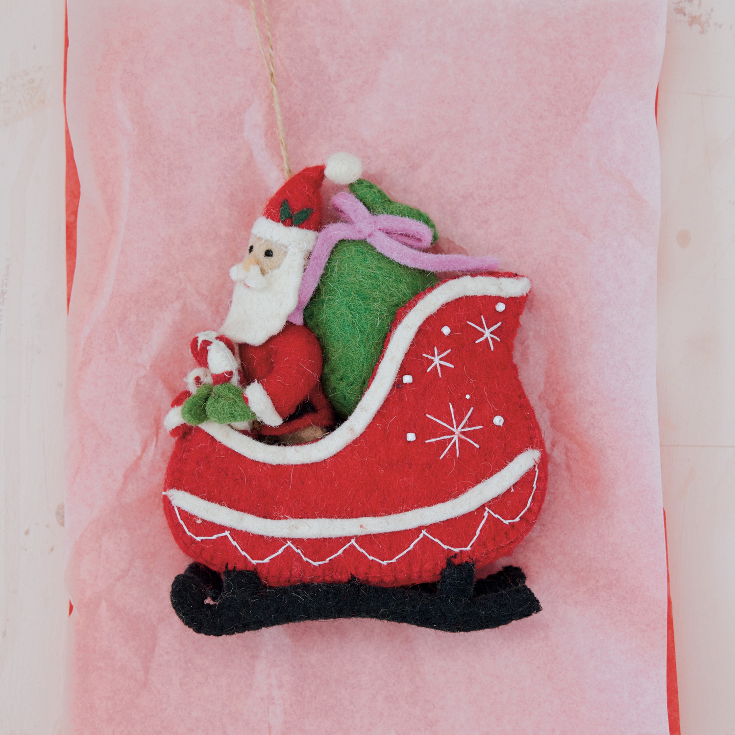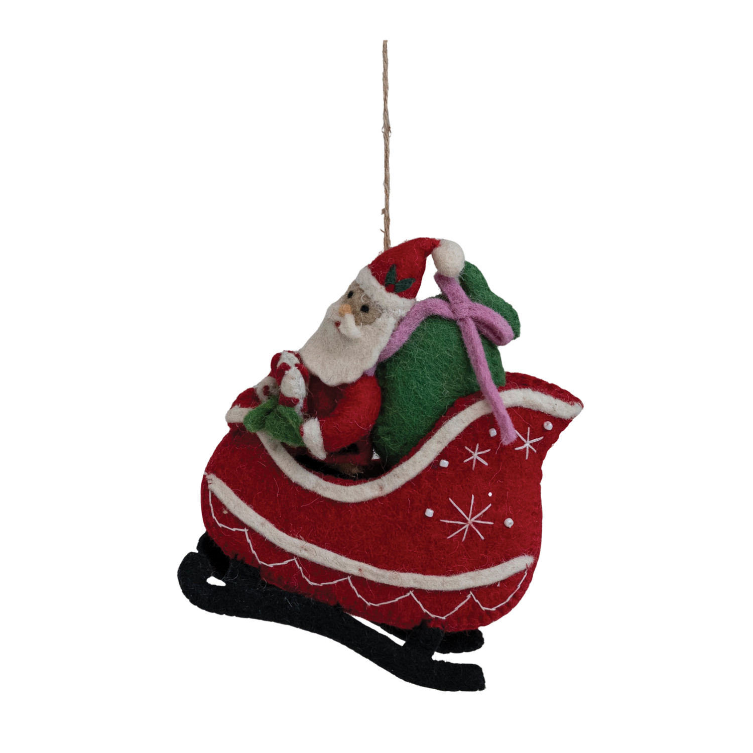 Catalog Name: 6"L x 6-1/2"H Wool Felt Santa in Sleigh Ornament w/ Embroidery & Beads, Multi Color ©