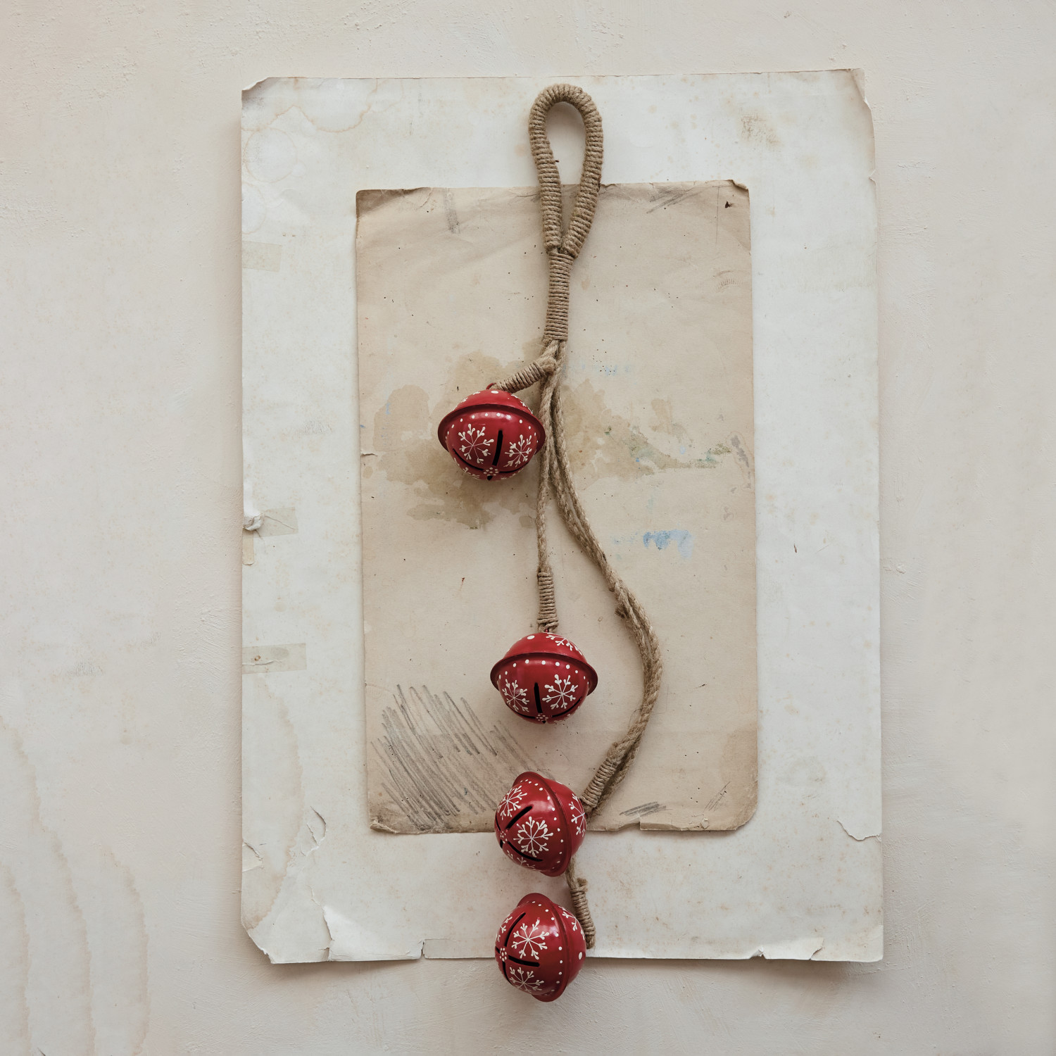 Hanging Hand-Painted Metal Jingle Bell Cluster with Snowflakes & Jute Hanger, Red