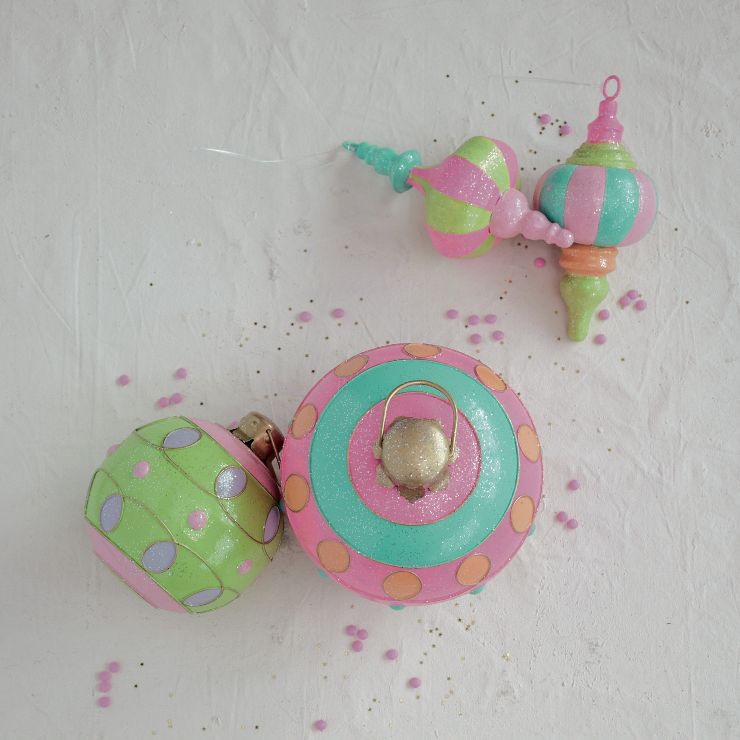 Oversized Painted Metal Ball Ornament with Pattern & Glitter, Pink, Orange Color & Blue