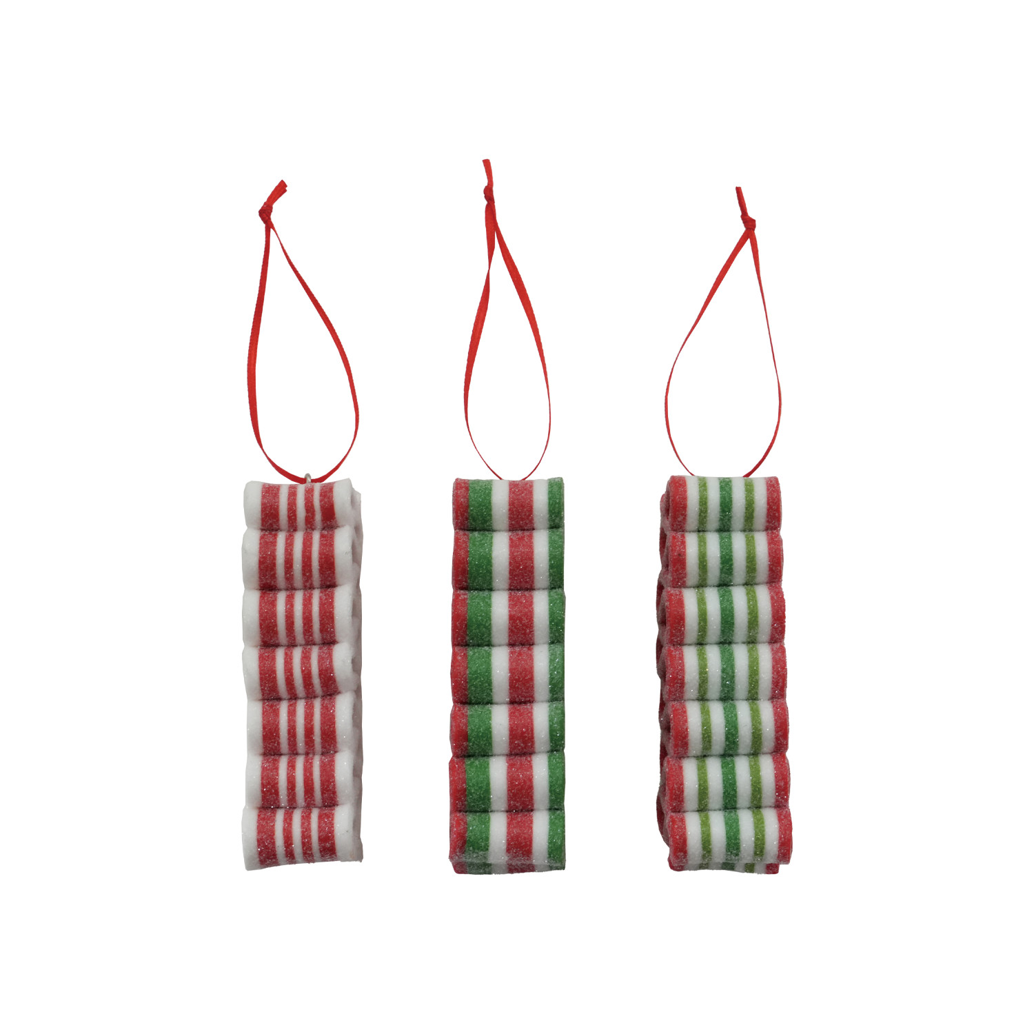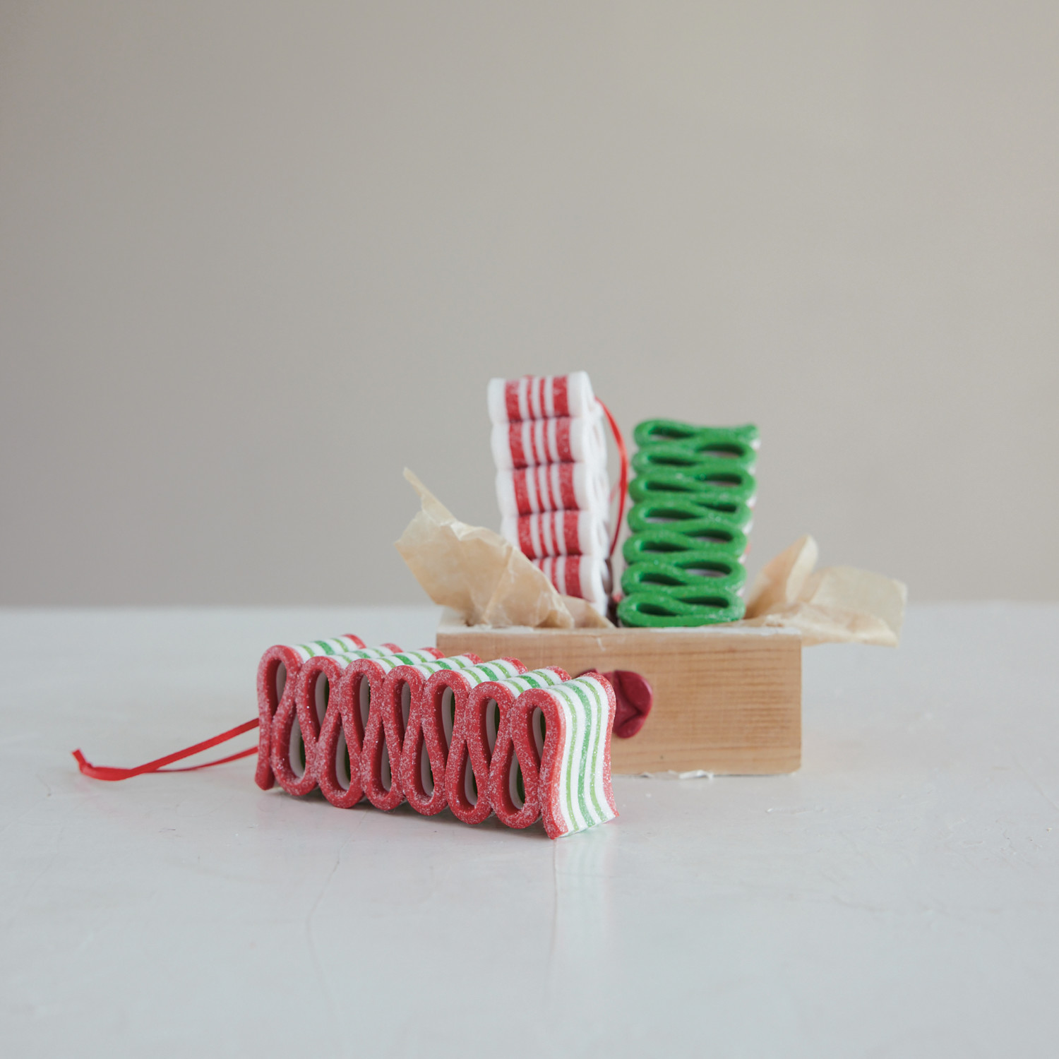 Clay Striped Ribbon Candy Ornament with Glitter, 3 Styles