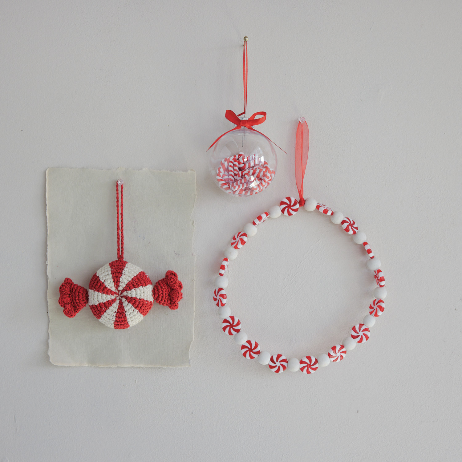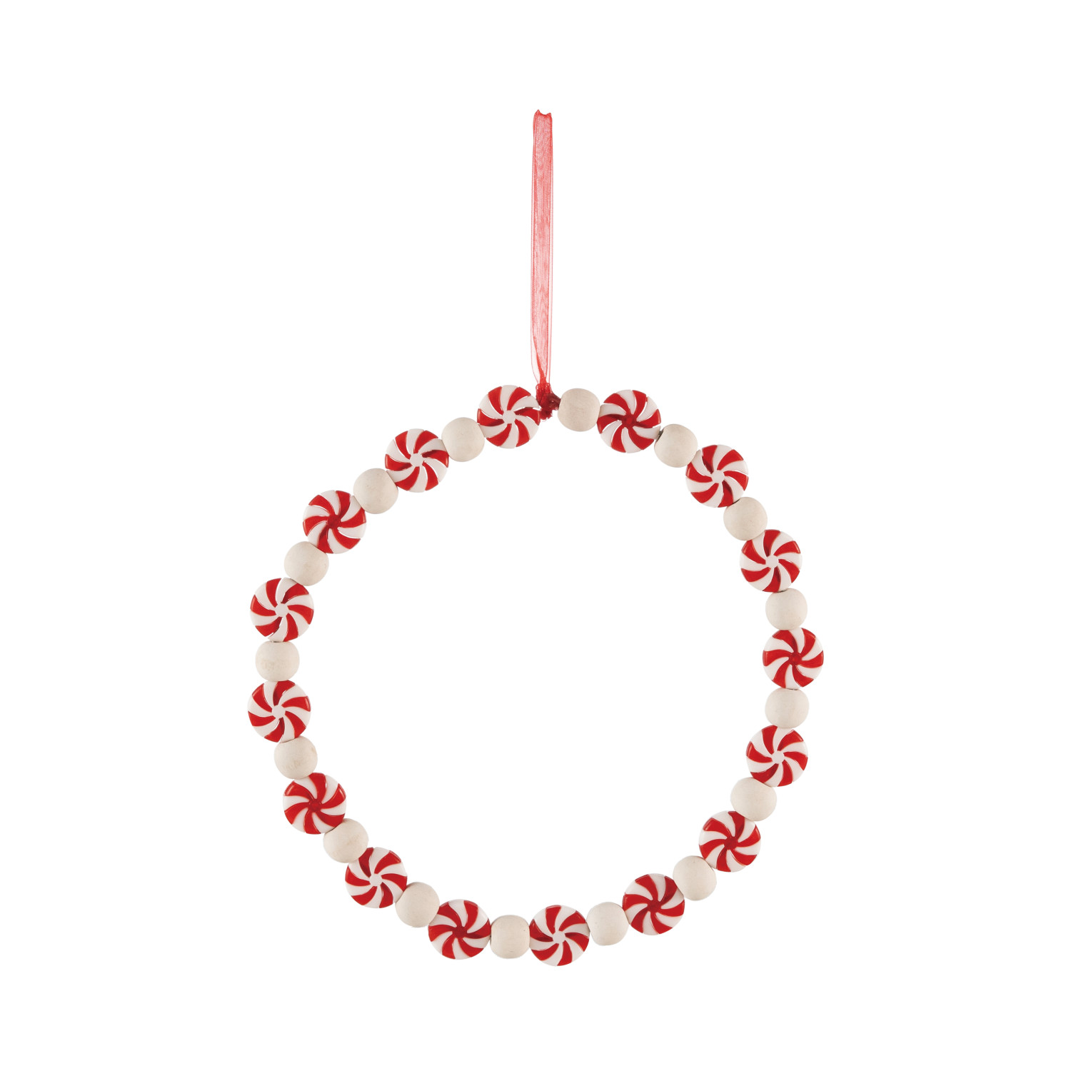 Wood & Plastic Candy Wreath Ornament, White & Red
