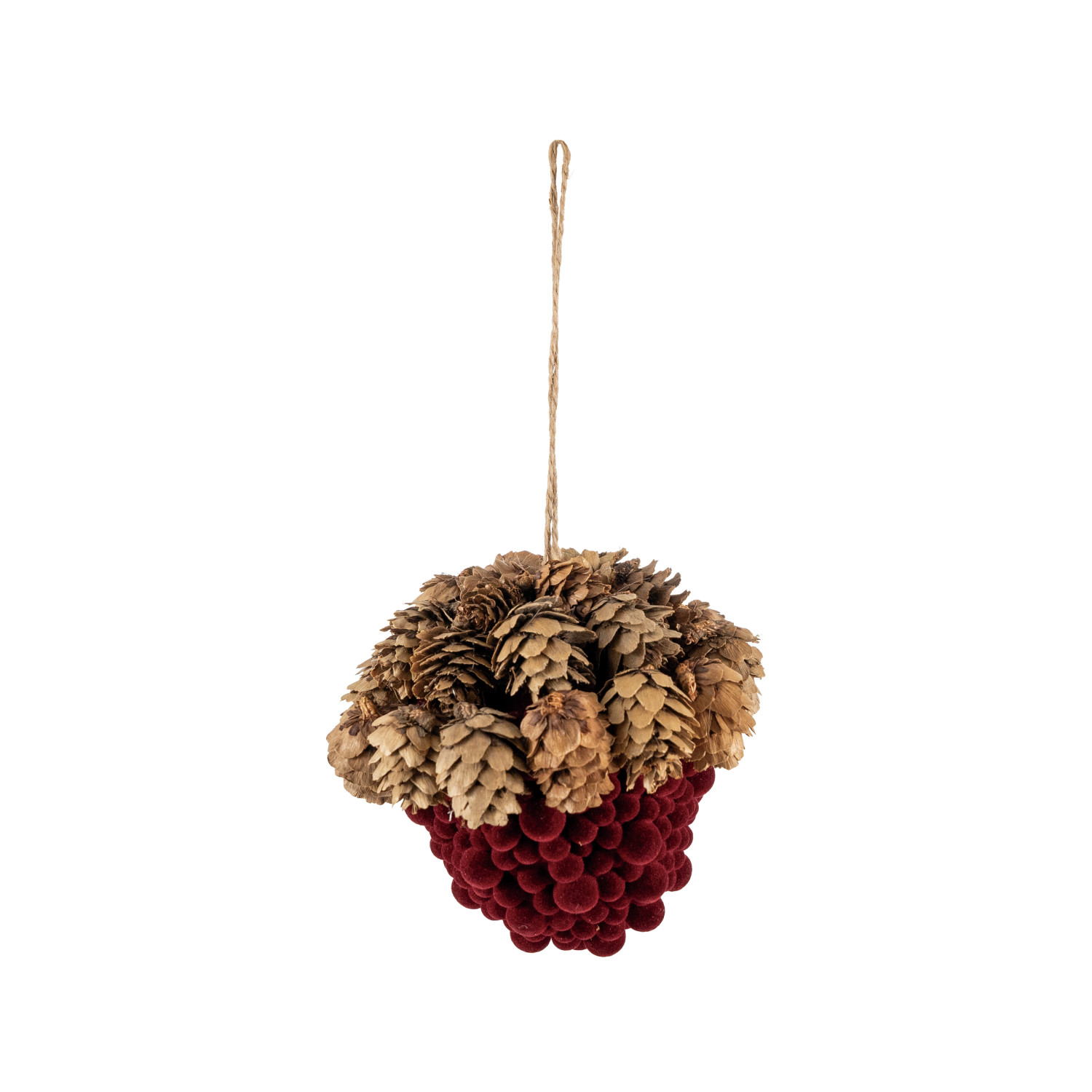 Catalog Name: 4-1/4" Round Flocked Foam Ball Acorn Shaped Ornament w/ Pinecones, Burgundy & Natural