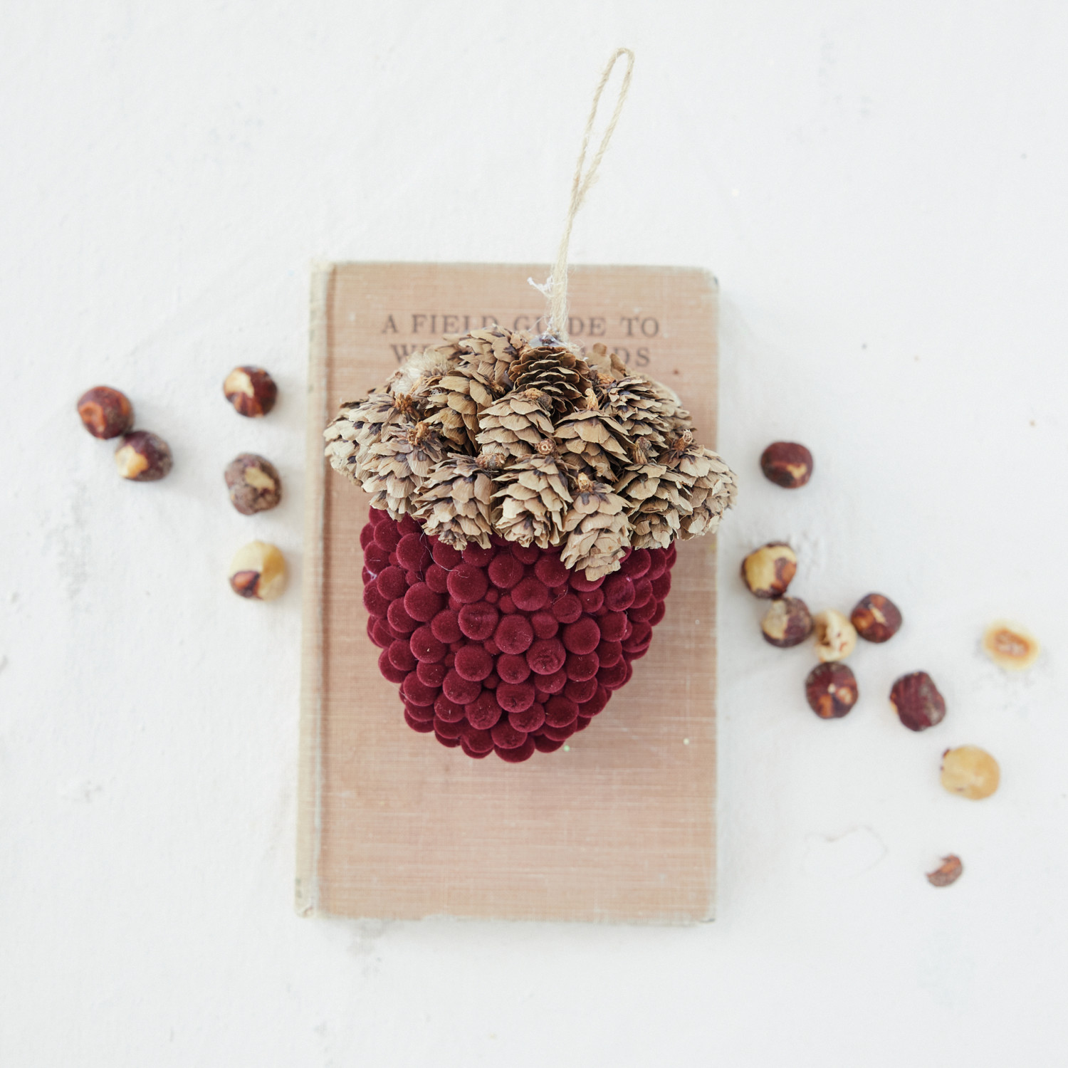 Flocked Foam Ball Acorn Shaped Ornament with Pinecones, Burgundy & Natural