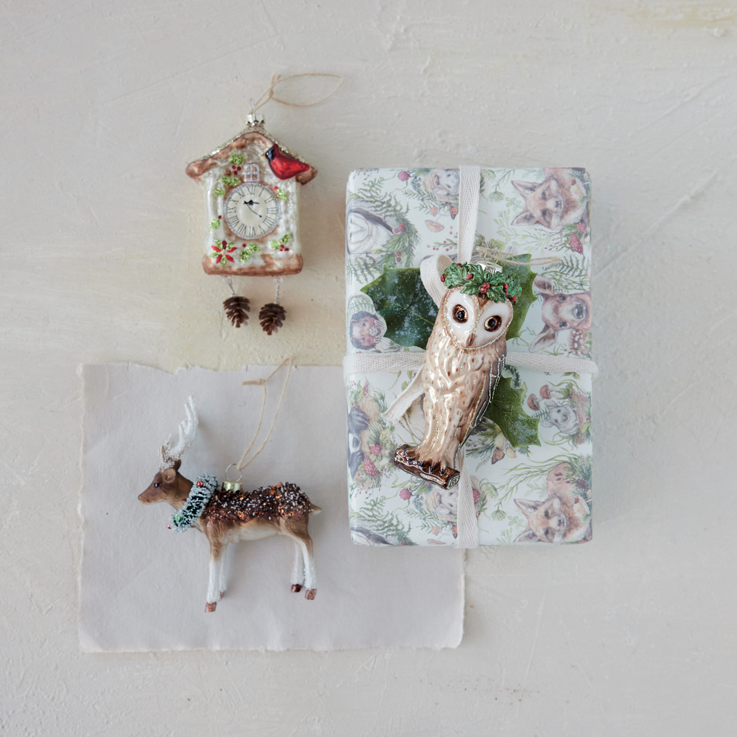 Catalog Name: 5-3/4"H Hand-Painted Glass Owl Ornament w/ Holly Crown & Glitter, Multi Color
