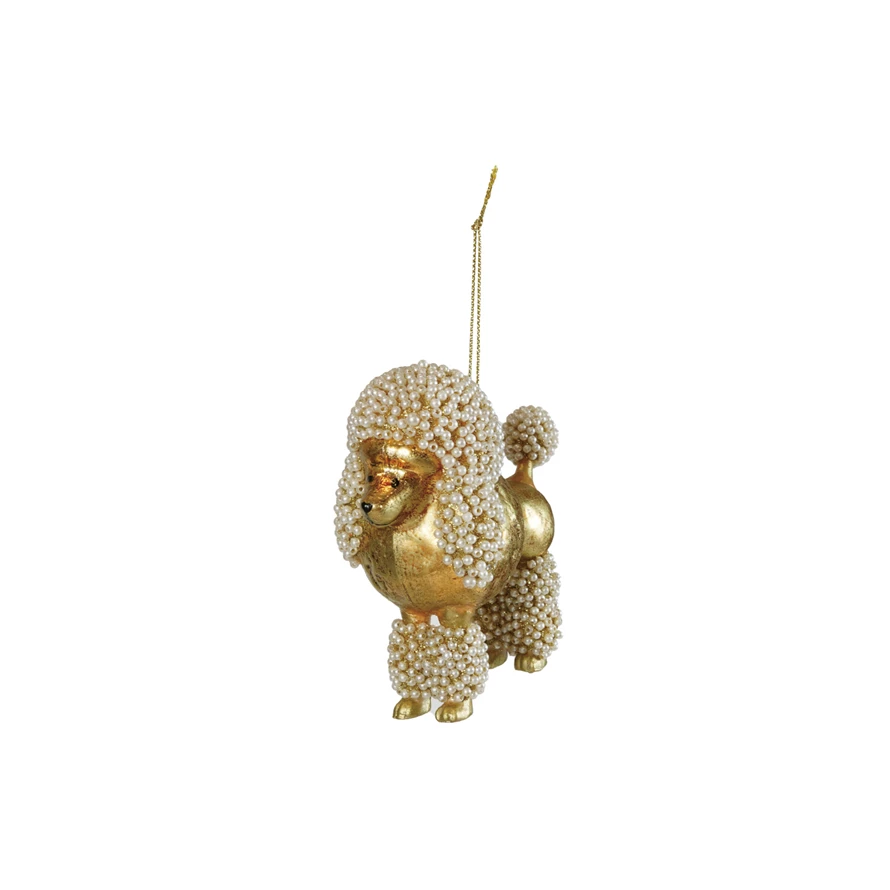 Catalog Name: 4-1/4"L x 4"H Glass Poodle Ornament w/ Faux Pearls, Gold Finish