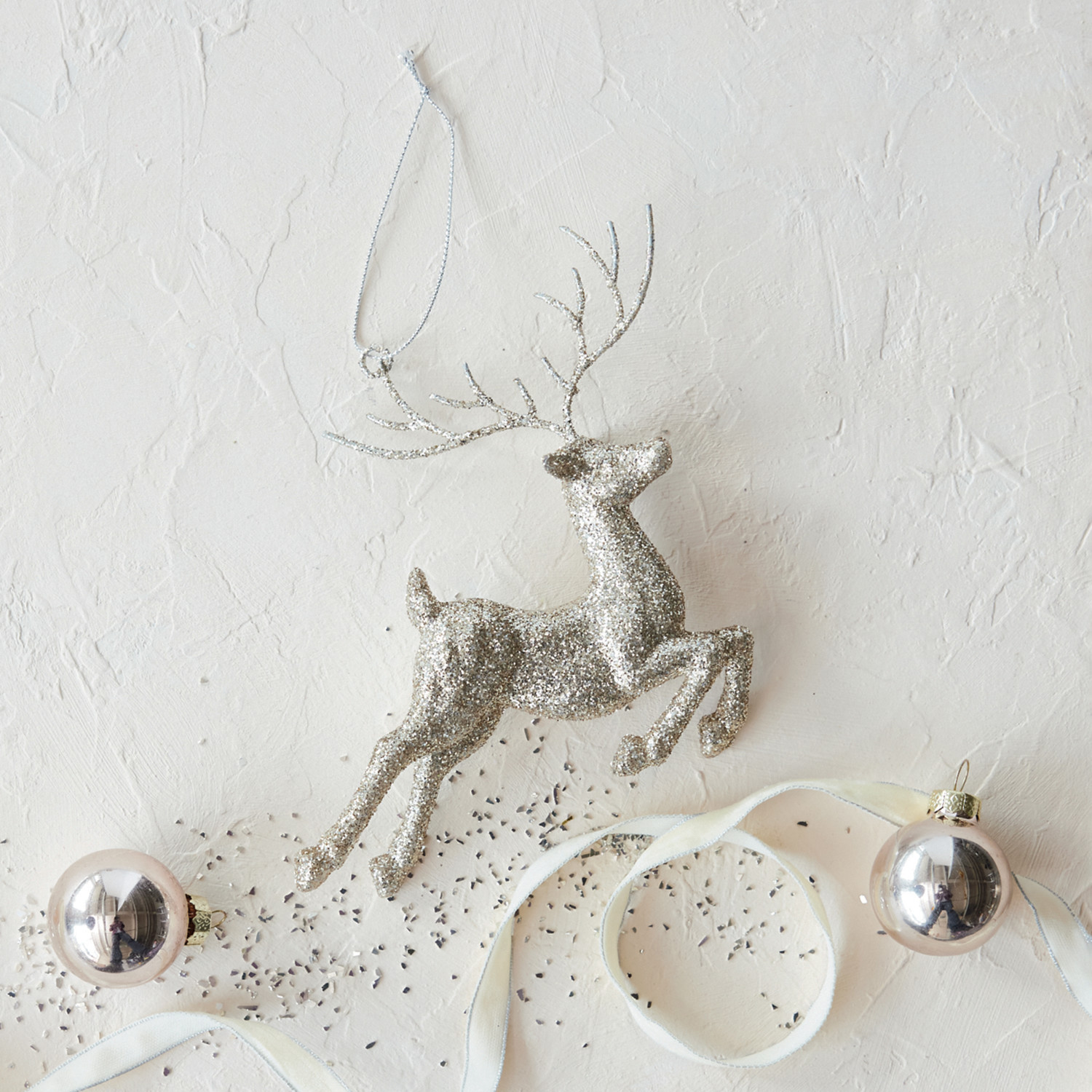 Catalog Name: 6-1/2"L x 5"H Acrylic Reindeer Ornament w/ Glitter, Champagne Finish