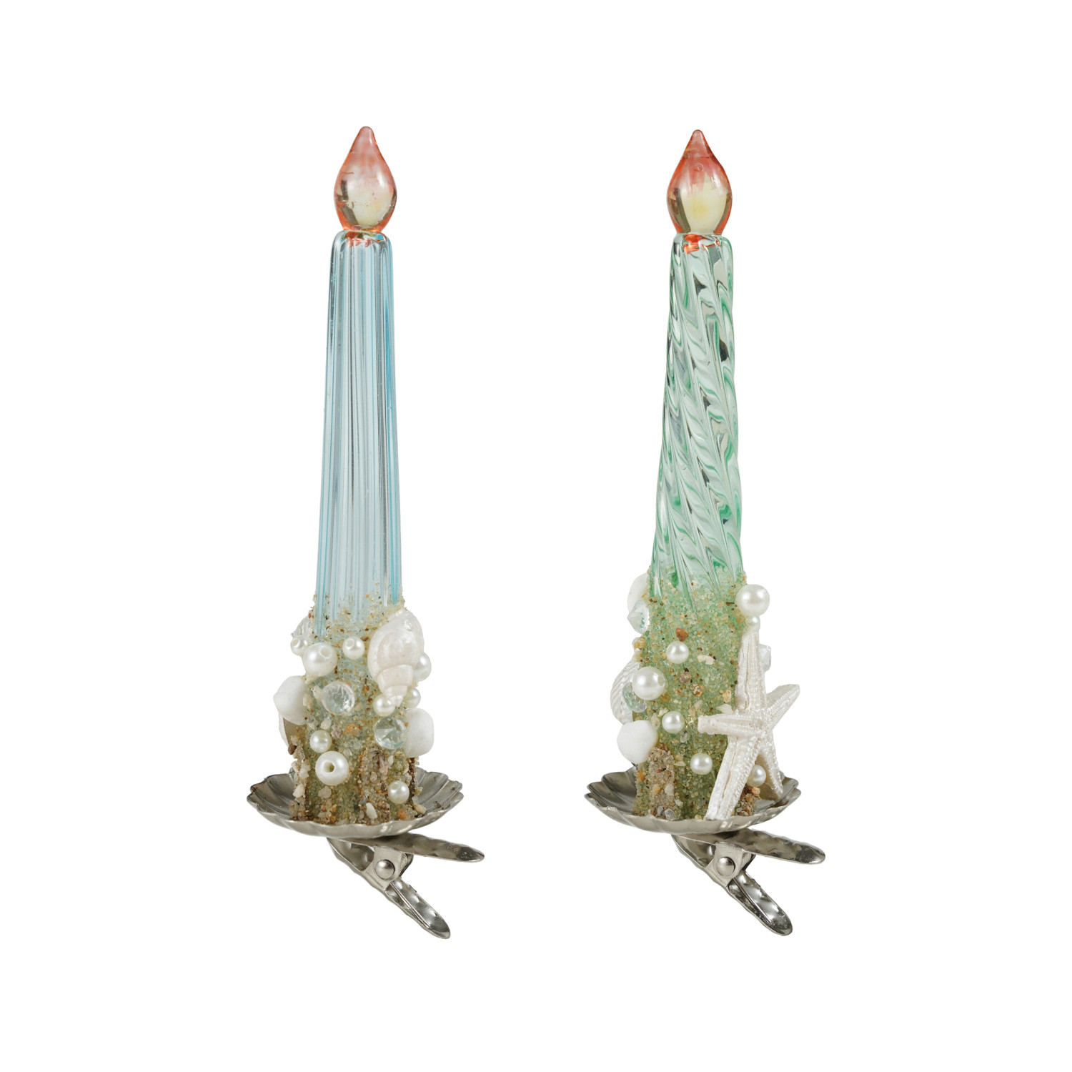 Catalog Name: 5-3/4"H Glass Taper Candle Clip-on Ornament w/ Sand, Shells & Faux Pearls, Multi Color, 2 Styles