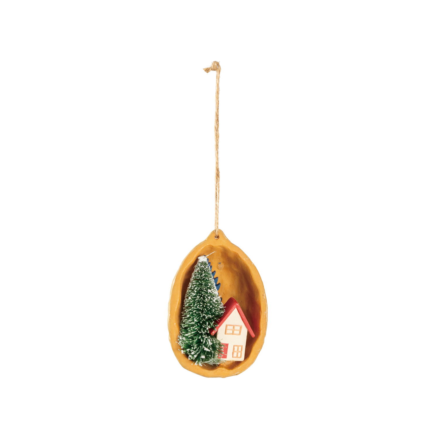 Catalog Name: 4-1/4"H Resin Walnut Half Shell Diorama Ornament w/ House & Sisal Bottle Brush Tree, Multi Color