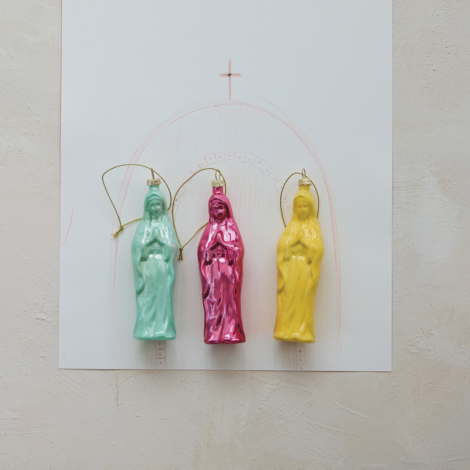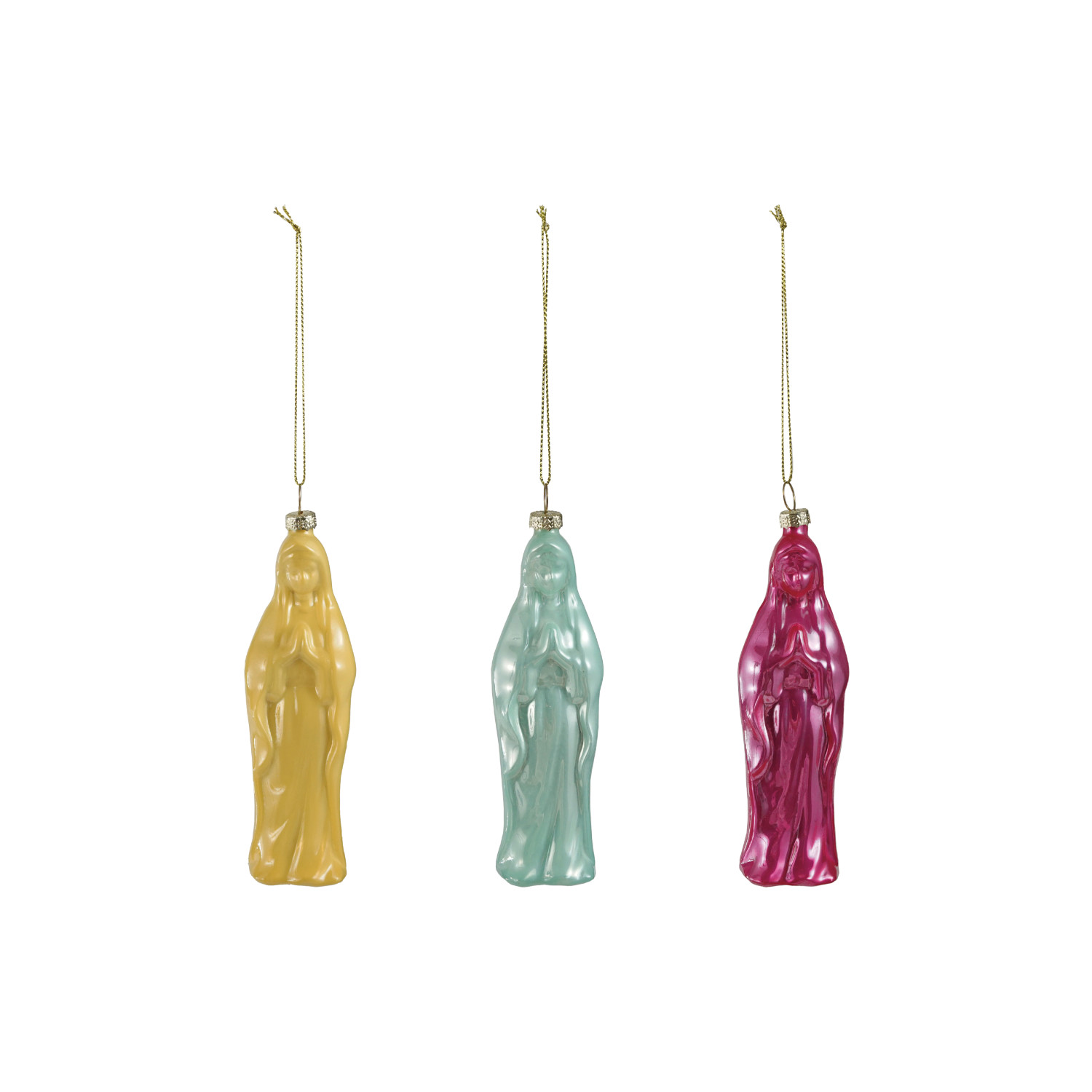 Catalog Name: 5"H Glass Mary Ornament, 3 Iridescent Colors